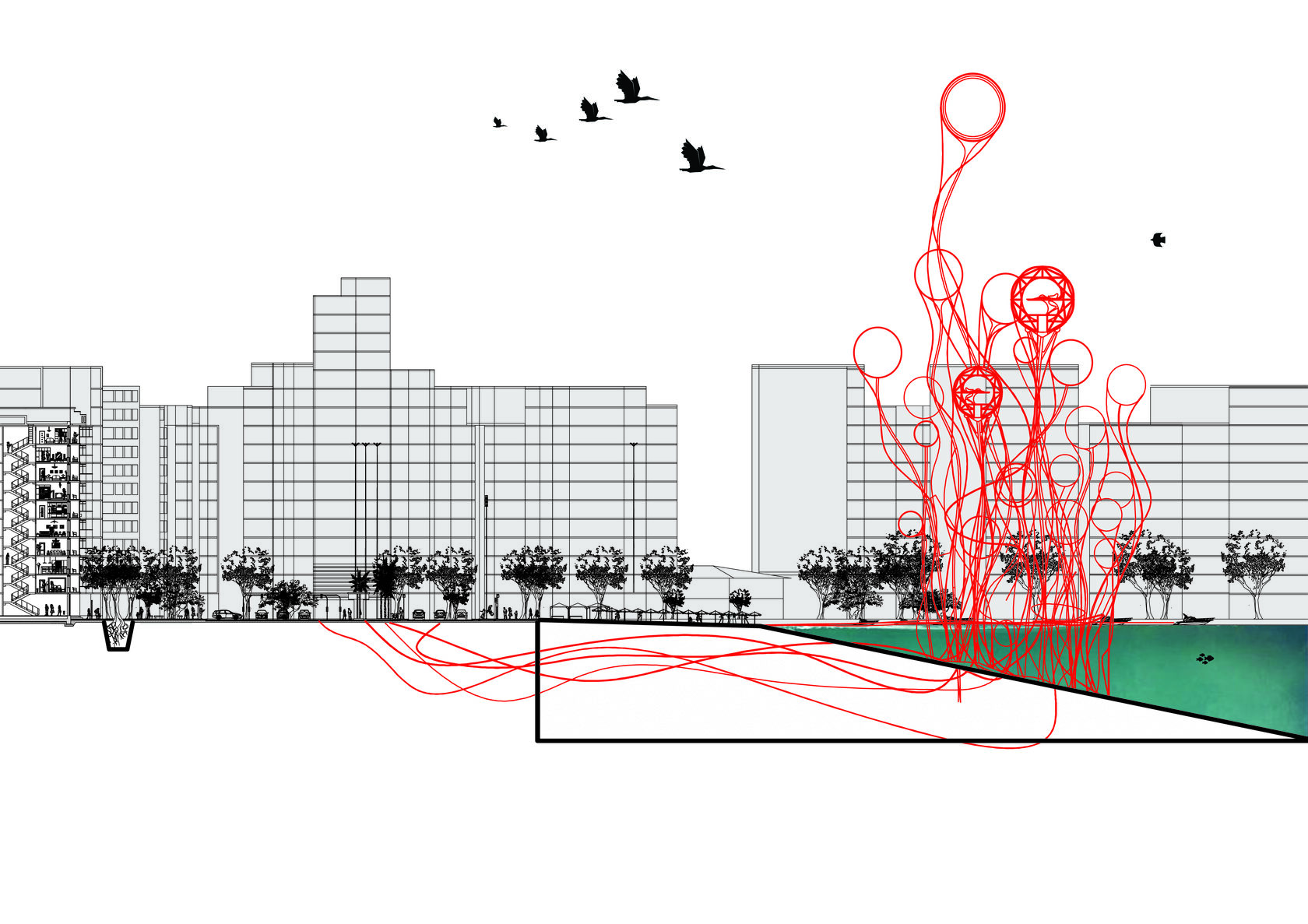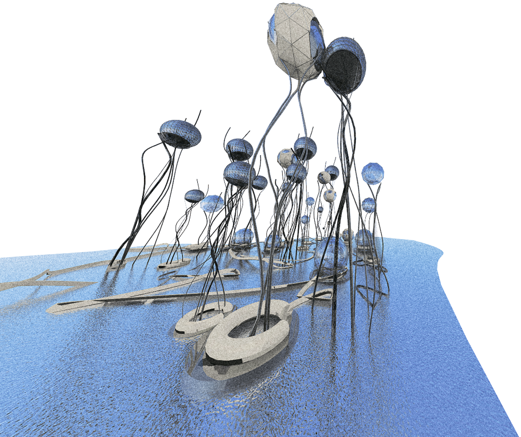 The project is an utopia based on class inequality. Favelas are against the wealthy parts of society. Creation of bubble hotels for rich people in the coastal area of Capocabana. Bubbles are scattered along the embankment and attached to the ground by the so-called hoses - communications. The bubbles - volumes are 5-star rooms with everything for comfort living.