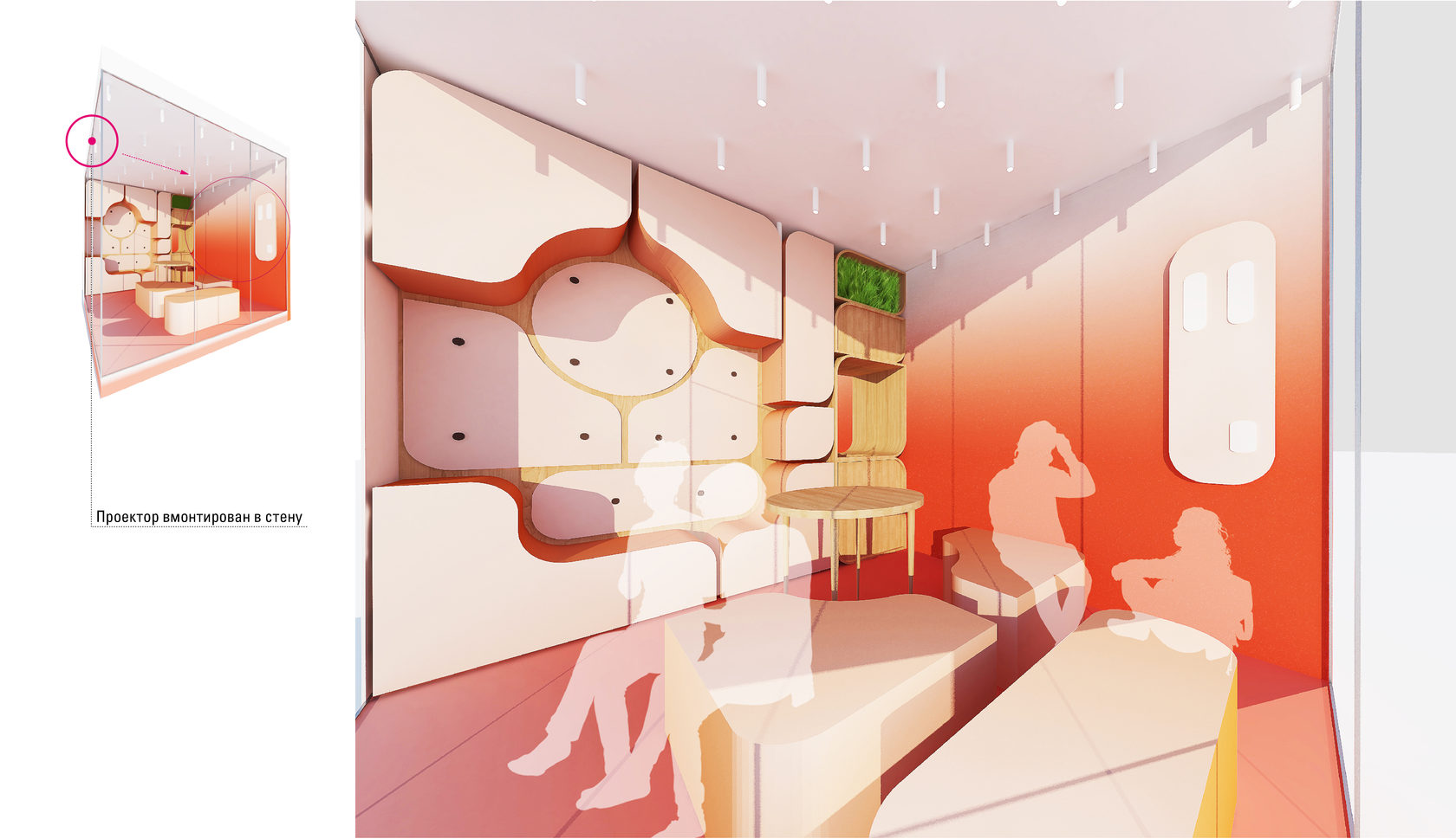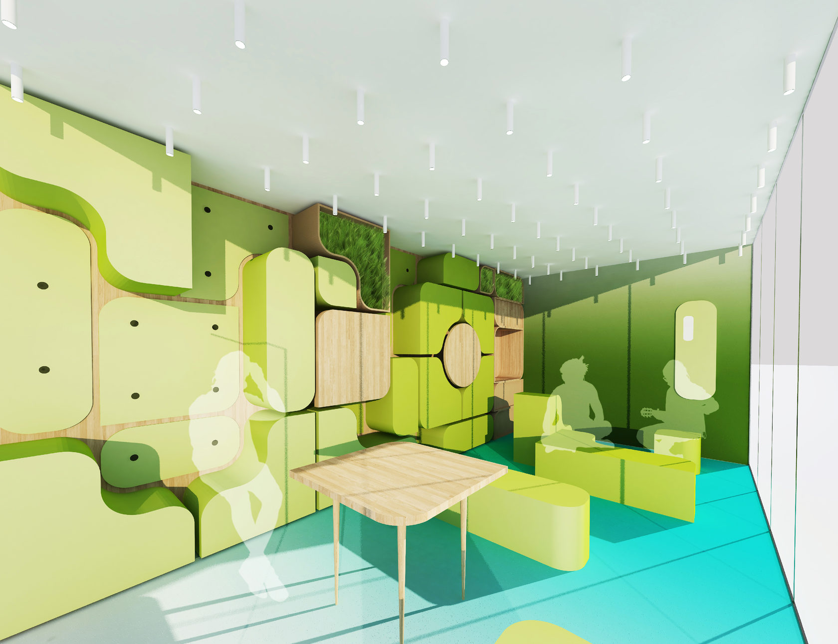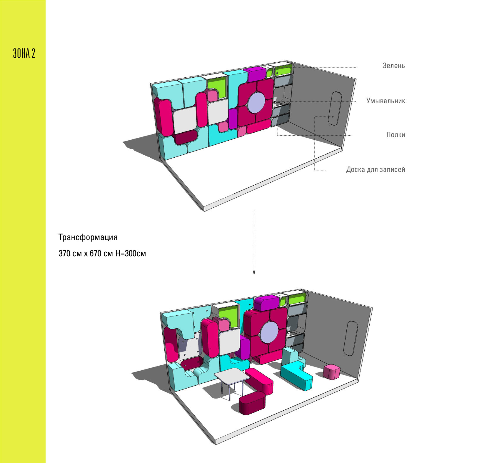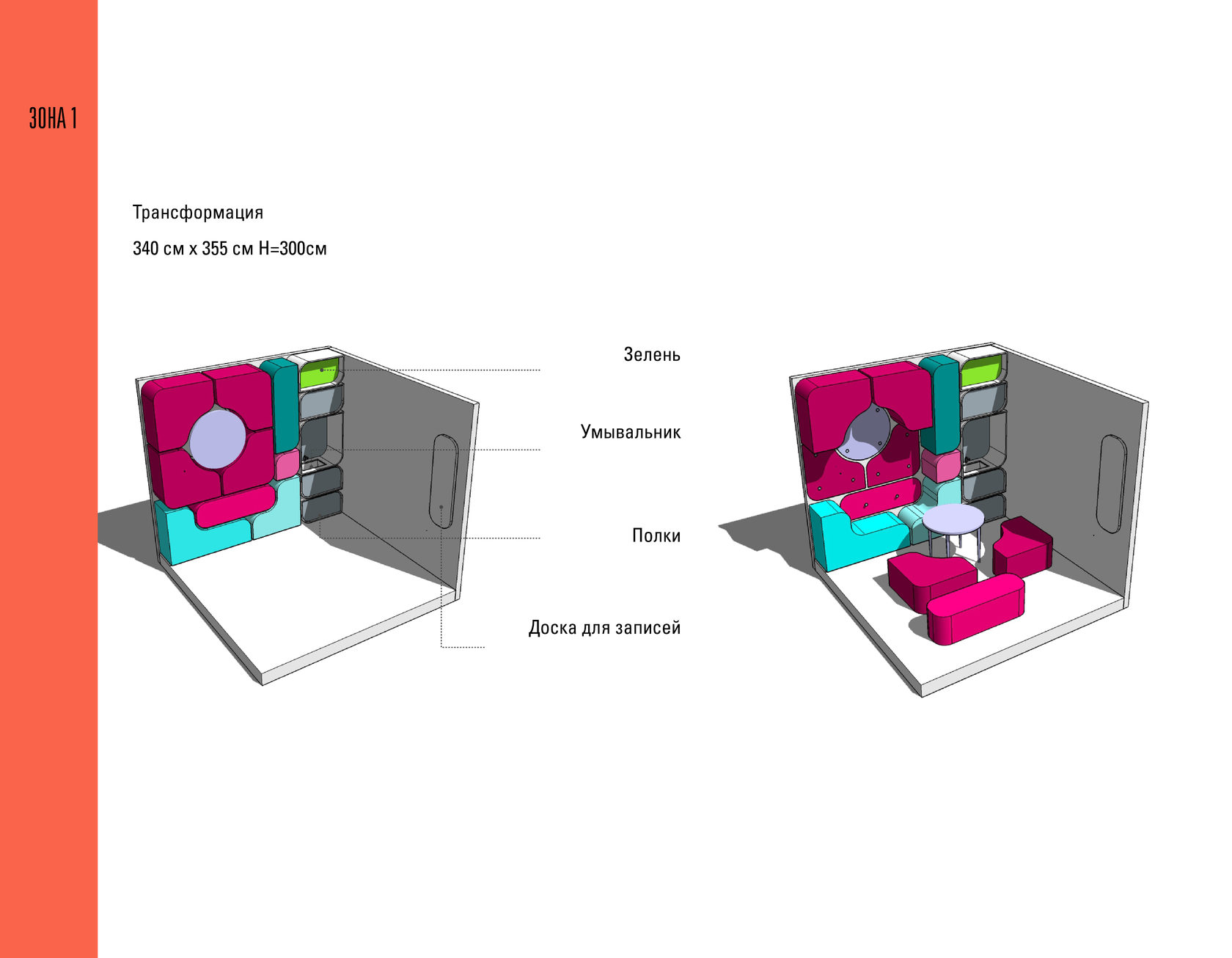 Each room has a modular system, the components of which can be used depending on the needs of people staying there.