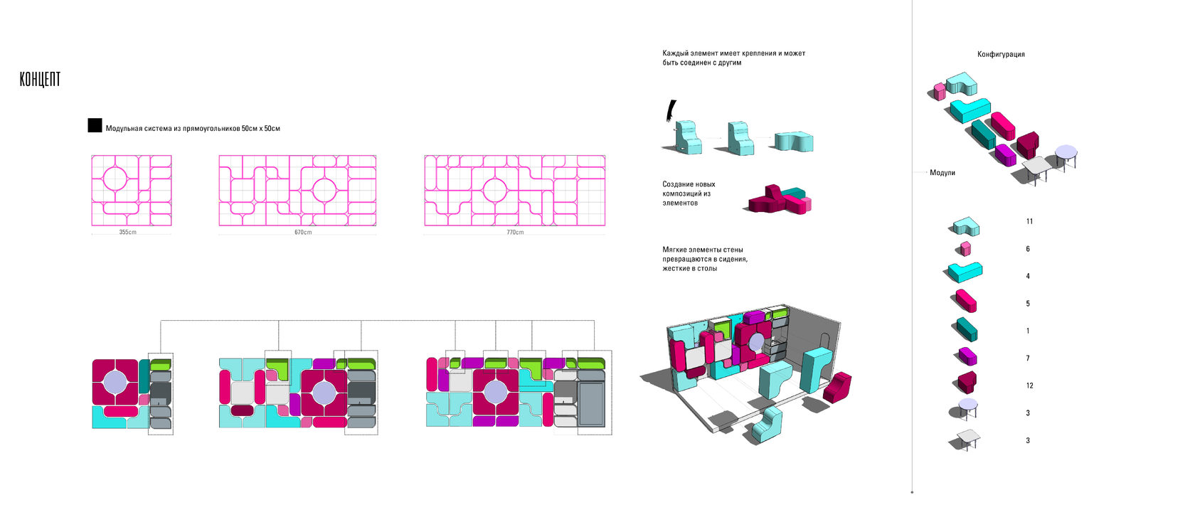 System is based on greed with modules 50sm x 50sm in order to have convinient dimentions.