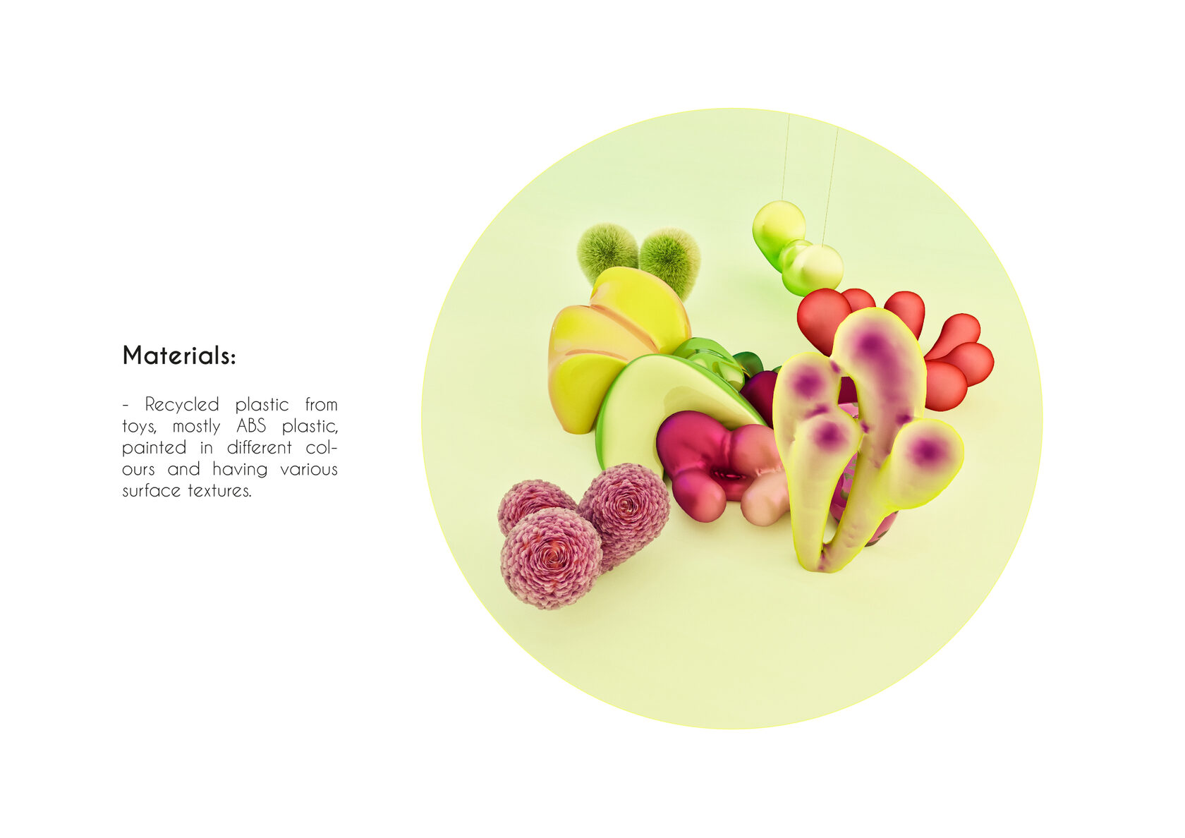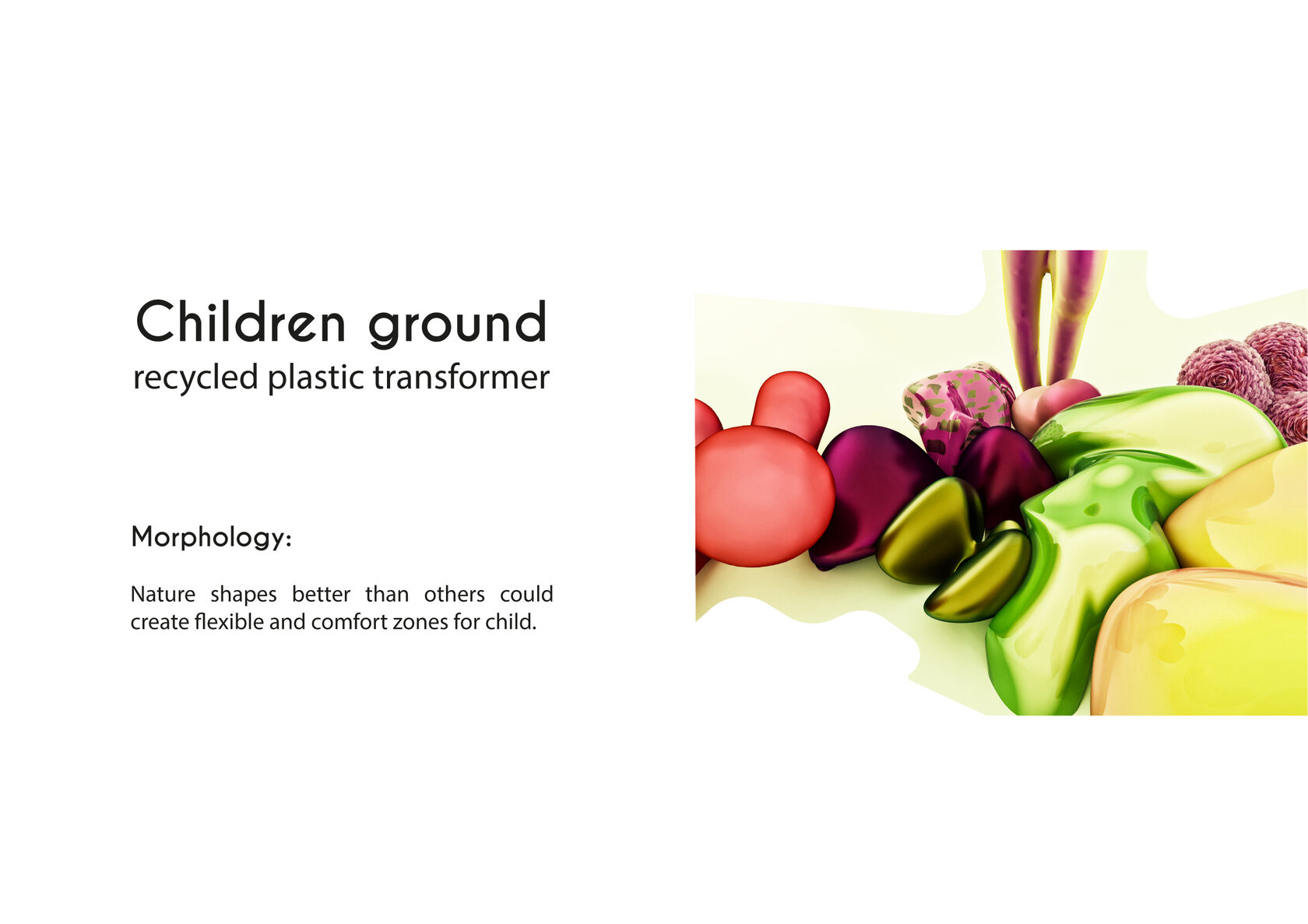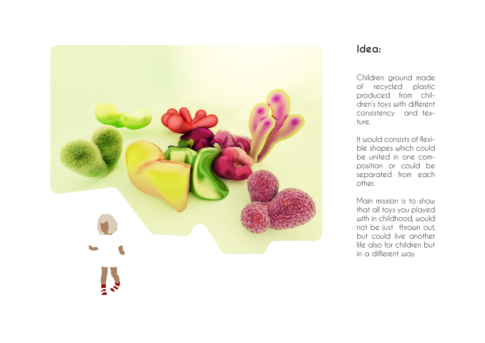 Children's playground furniture, all items are made of recycled plastic, they can be transformed into one composition or could create new small compositions. The idea of the project is - that once discarded toys can have a second, third or fourth life.