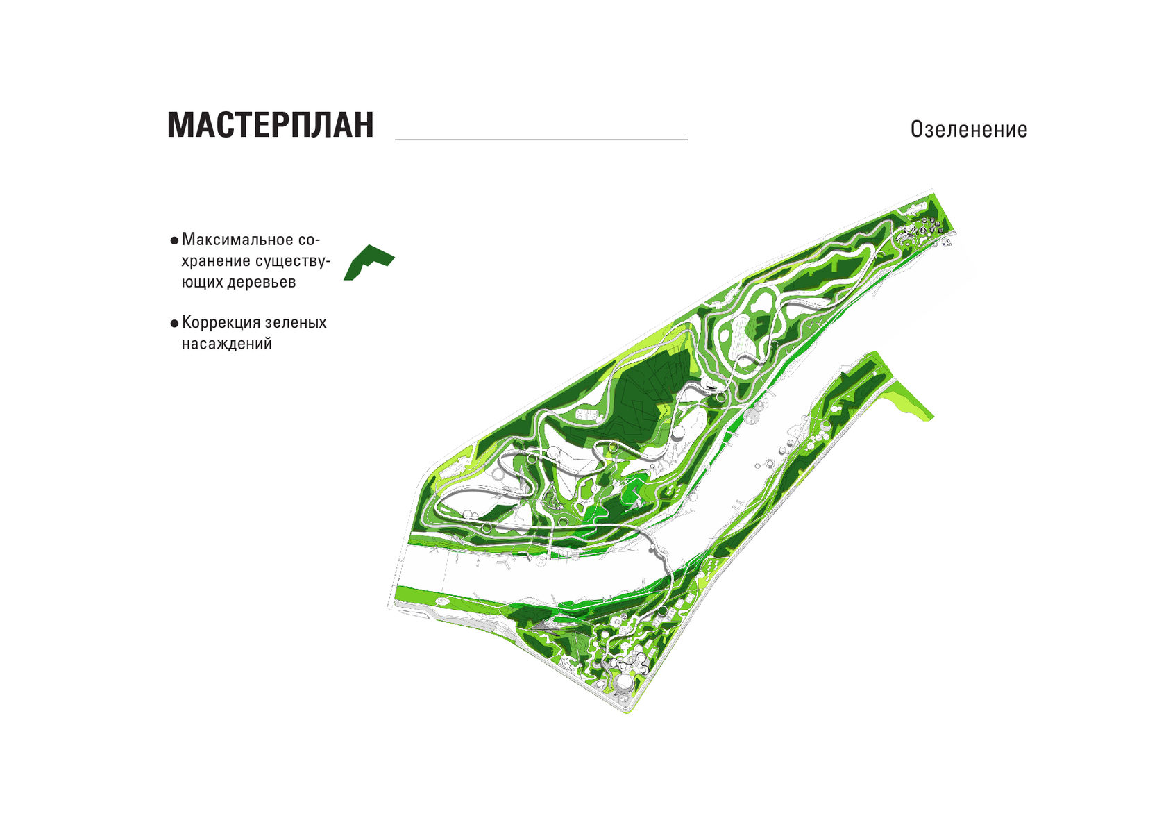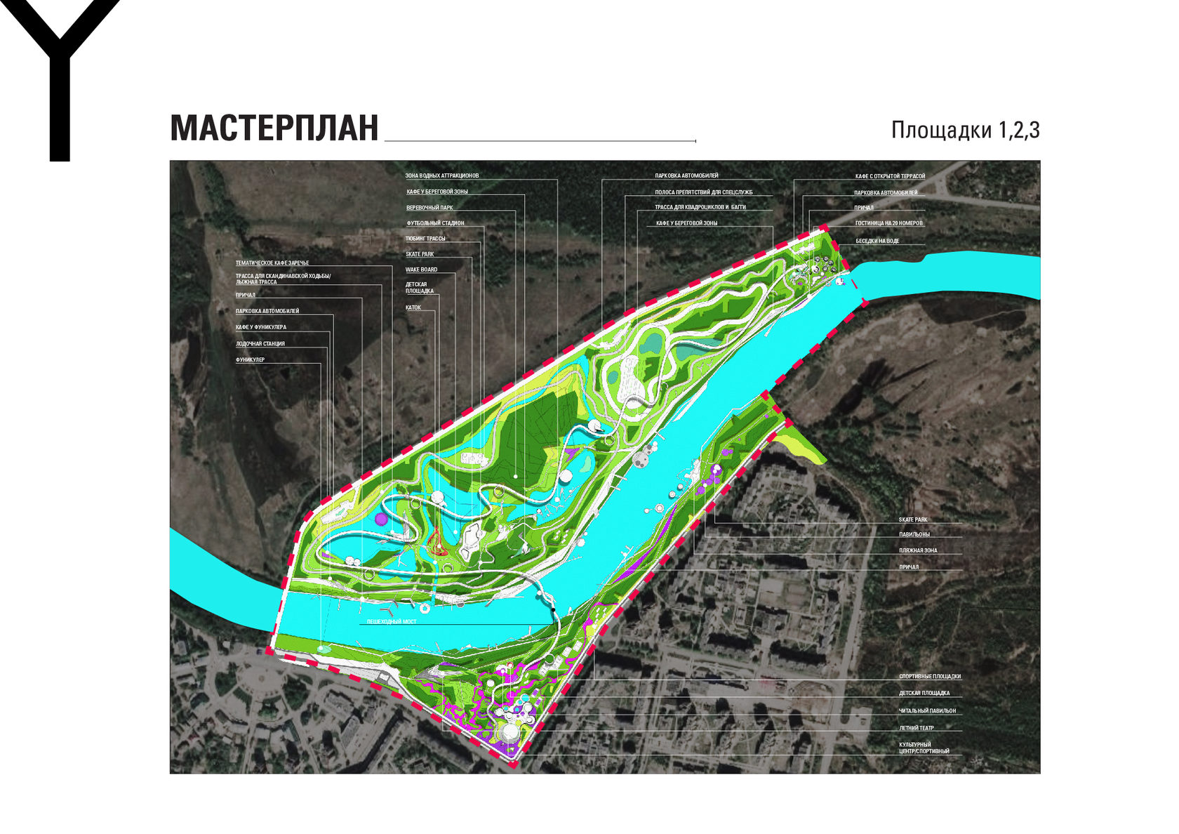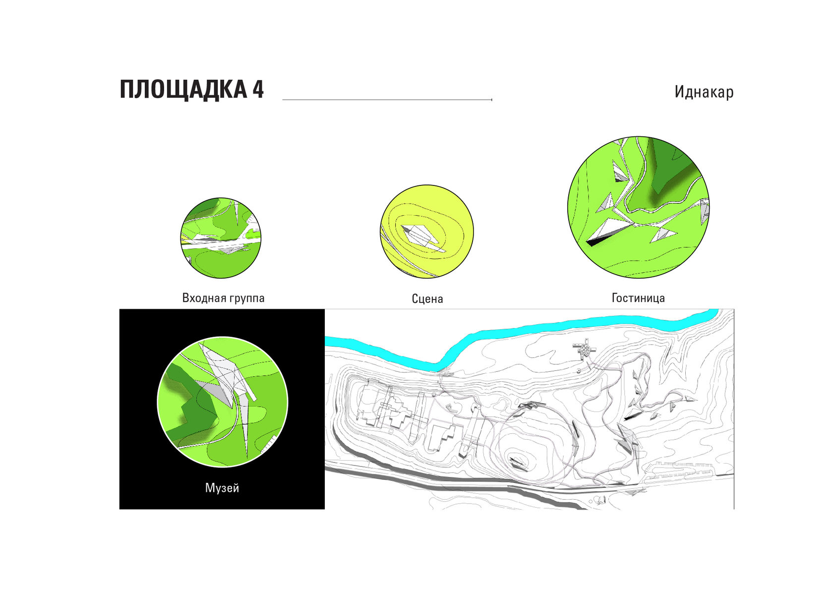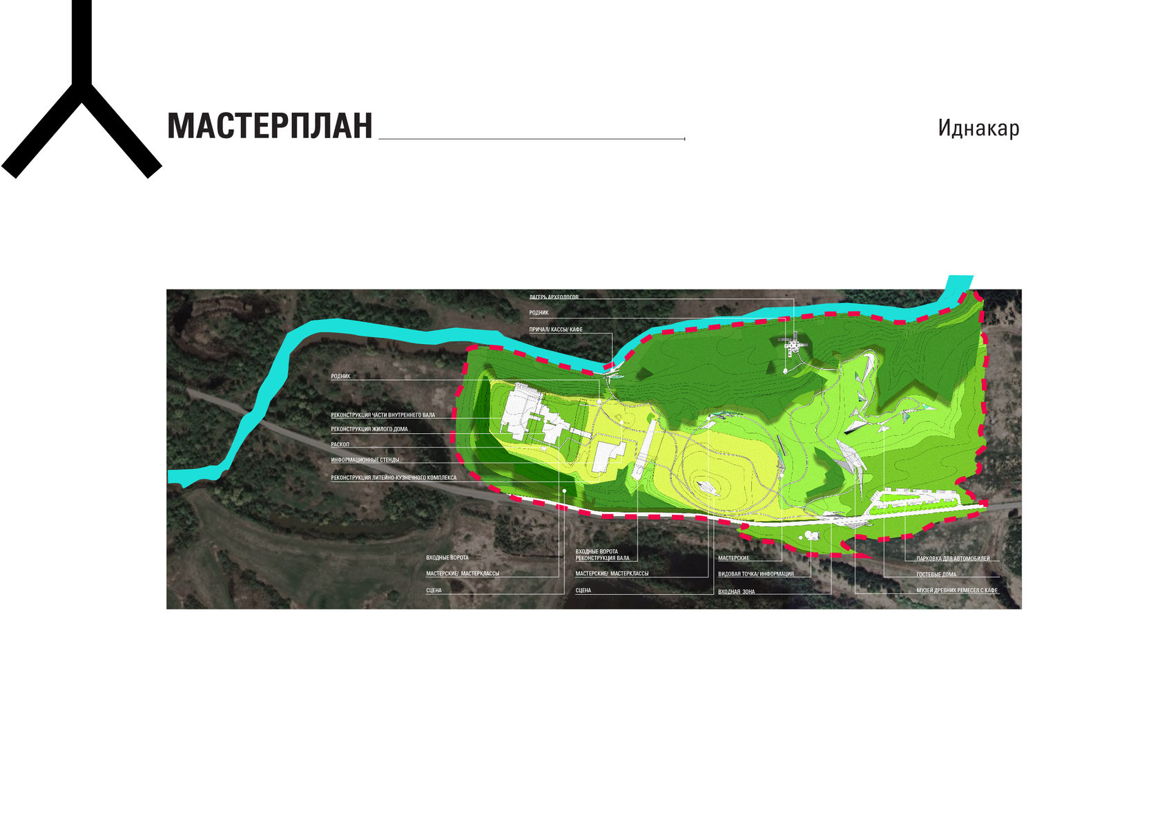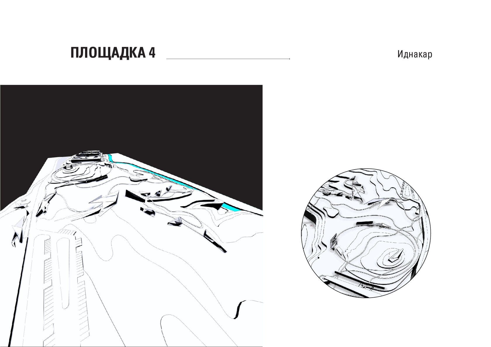 The project consists of two parts - a park in Glazov and the settlement of Idnakar. Plan forms are obtained and structures from ornaments. The park area is connected to the center of Glazov by a pedestrian bridge, which stretches along all the sites of the park, connecting them with each other. Also, artificial reservoirs have been dug out in the park, which are the second artery for movement.