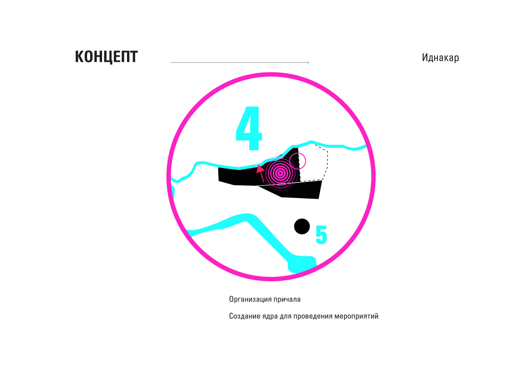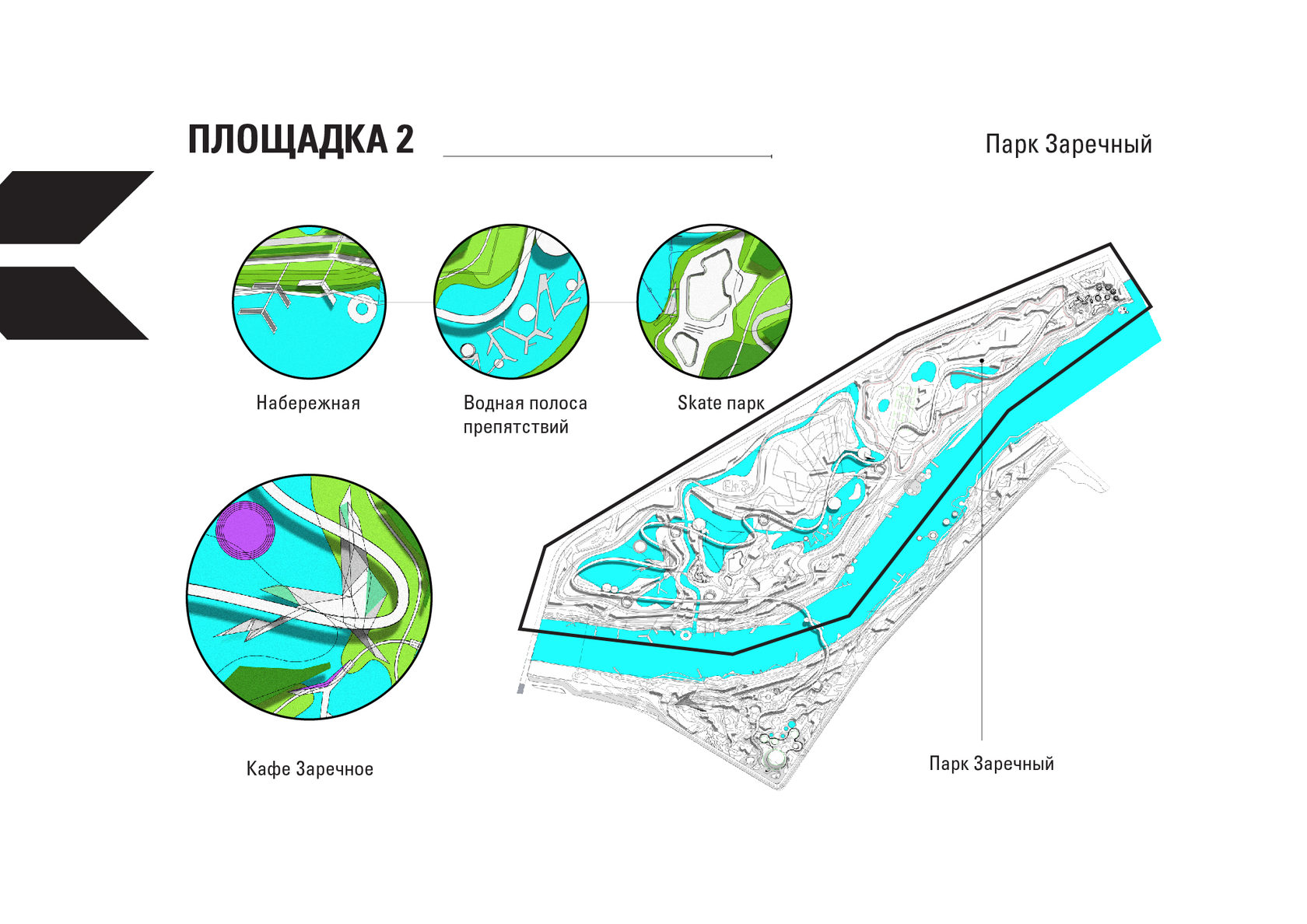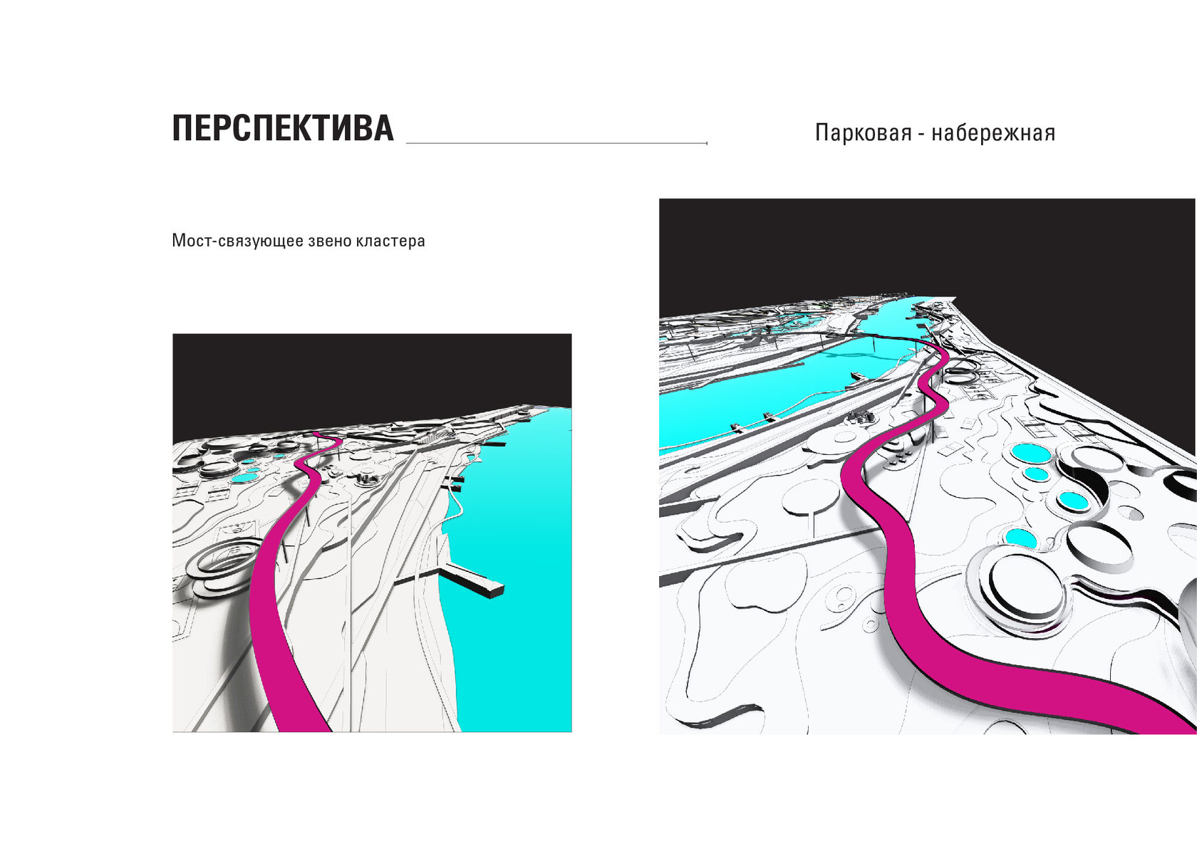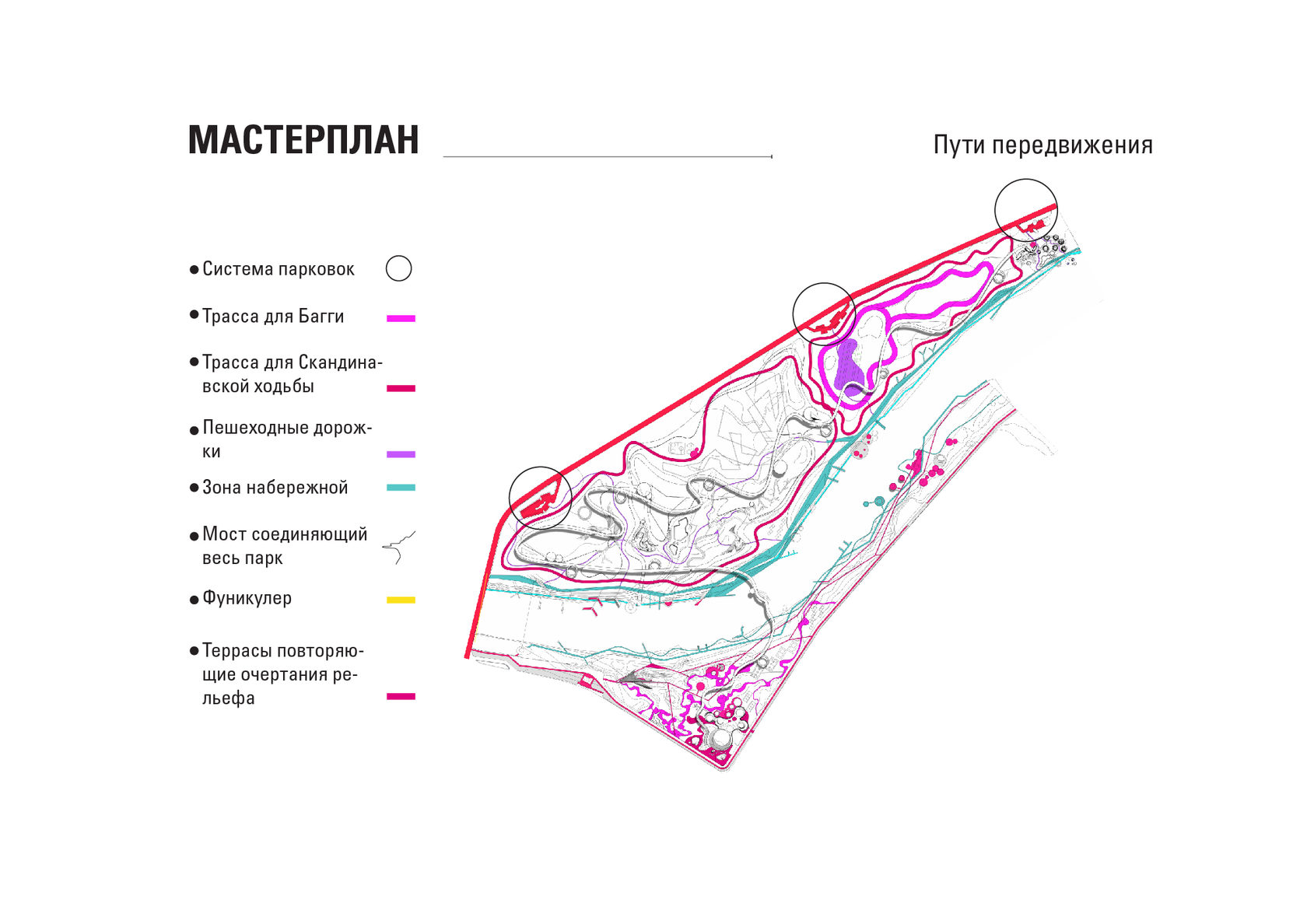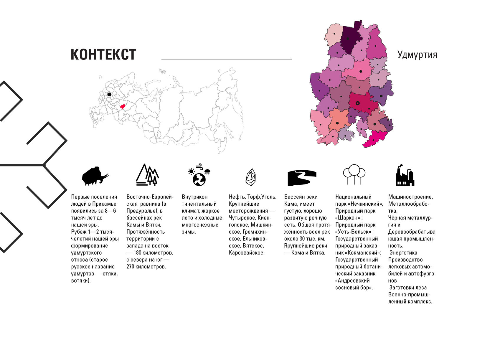 The project consists of two parts - a park in Glazov and the settlement of Idnakar. Plan forms are obtained and structures from ornaments. The park area is connected to the center of Glazov by a pedestrian bridge, which stretches along all the sites of the park, connecting them with each other. Also, artificial reservoirs have been dug out in the park, which are the second artery for movement.