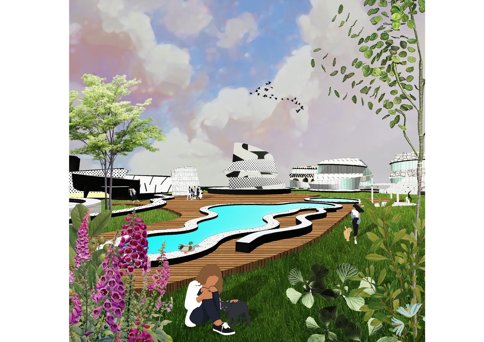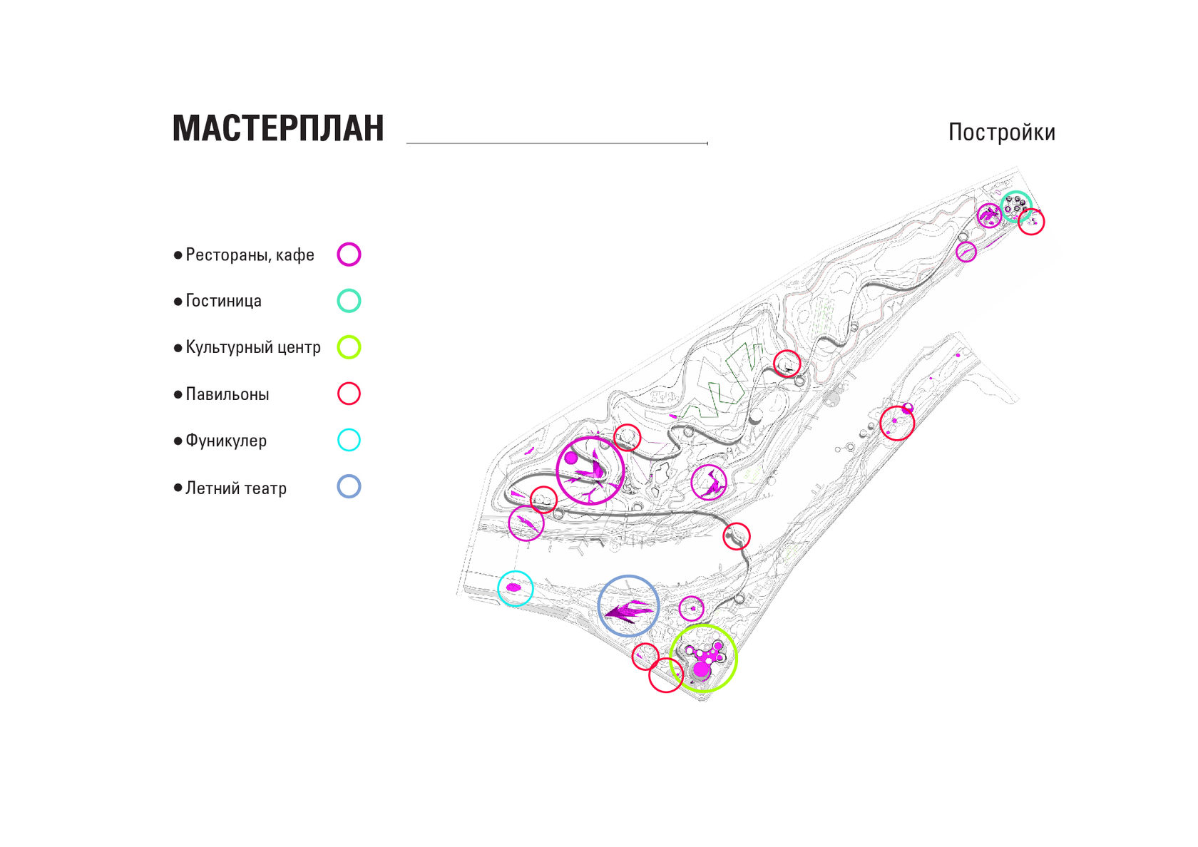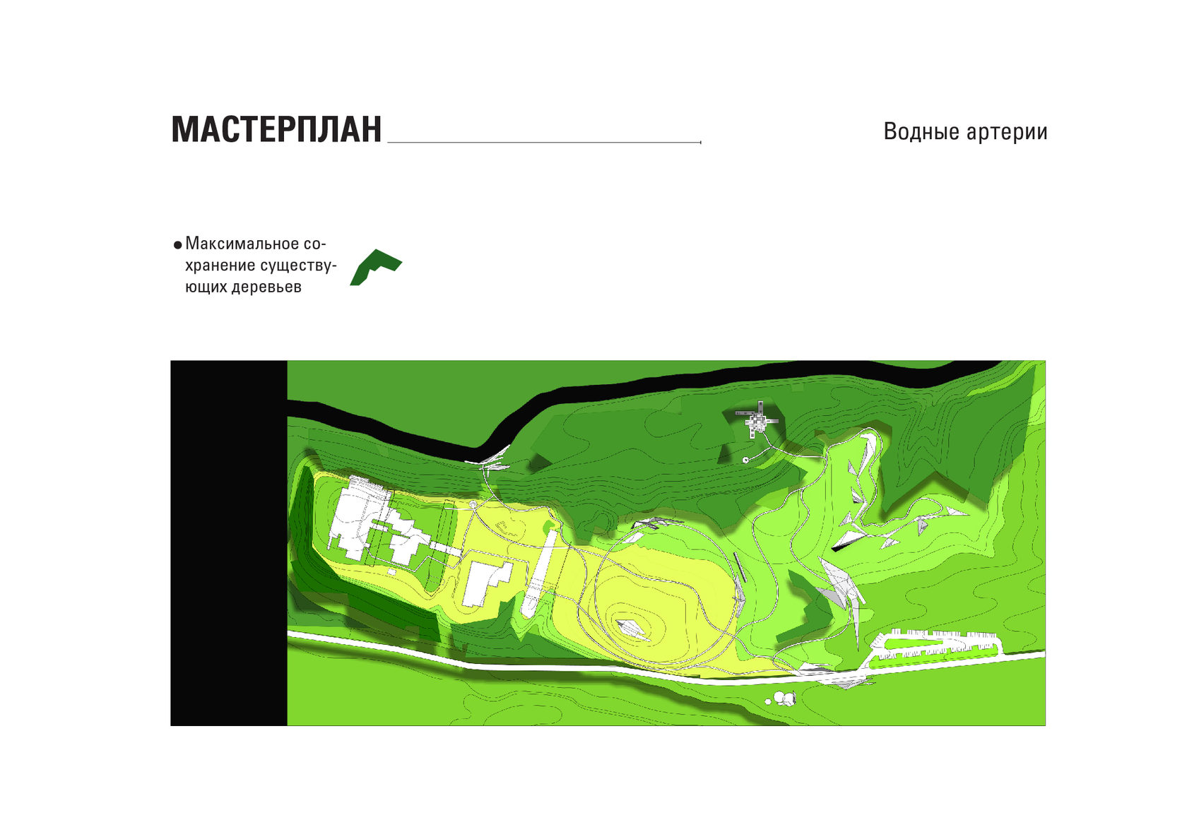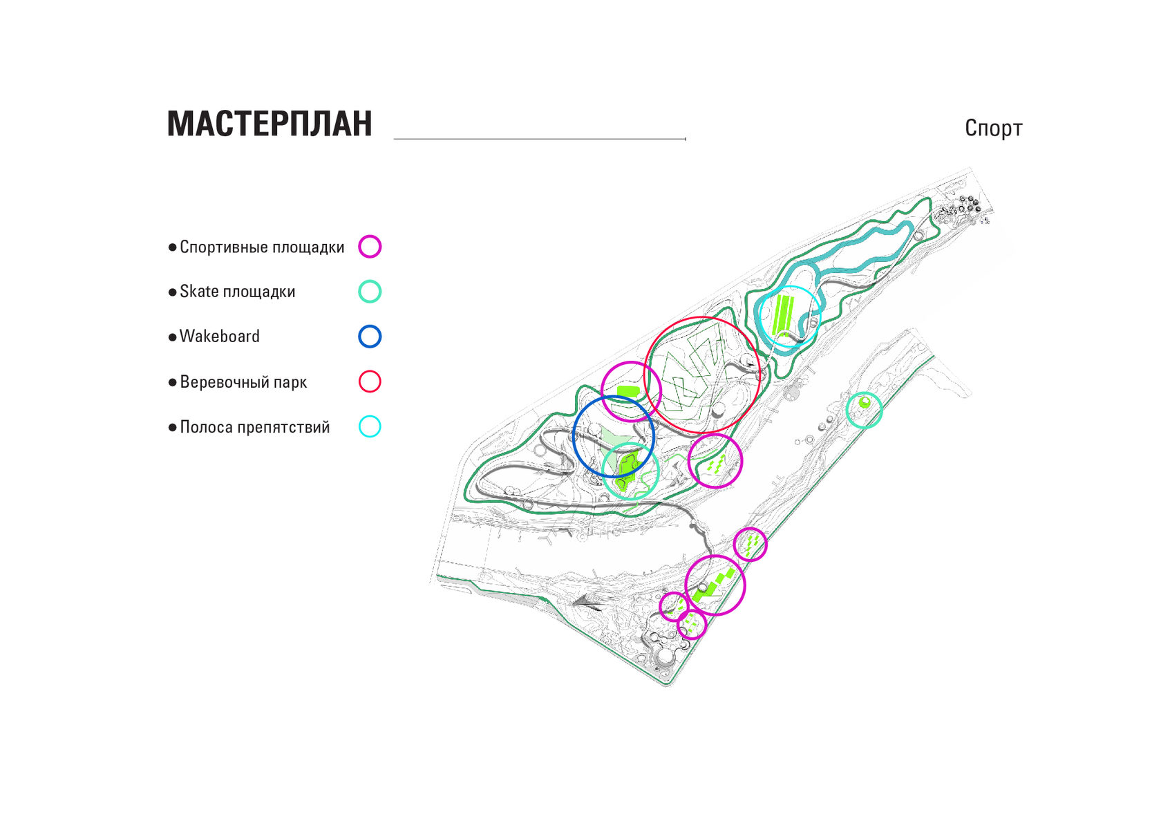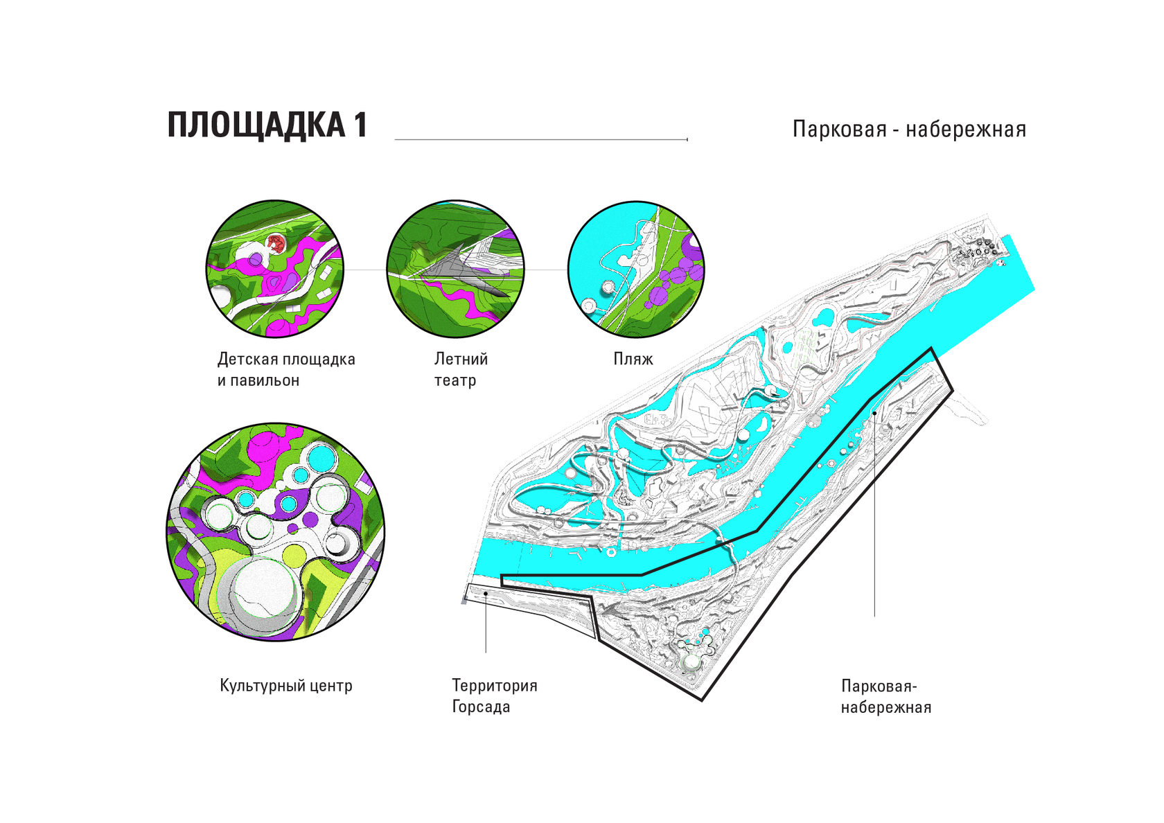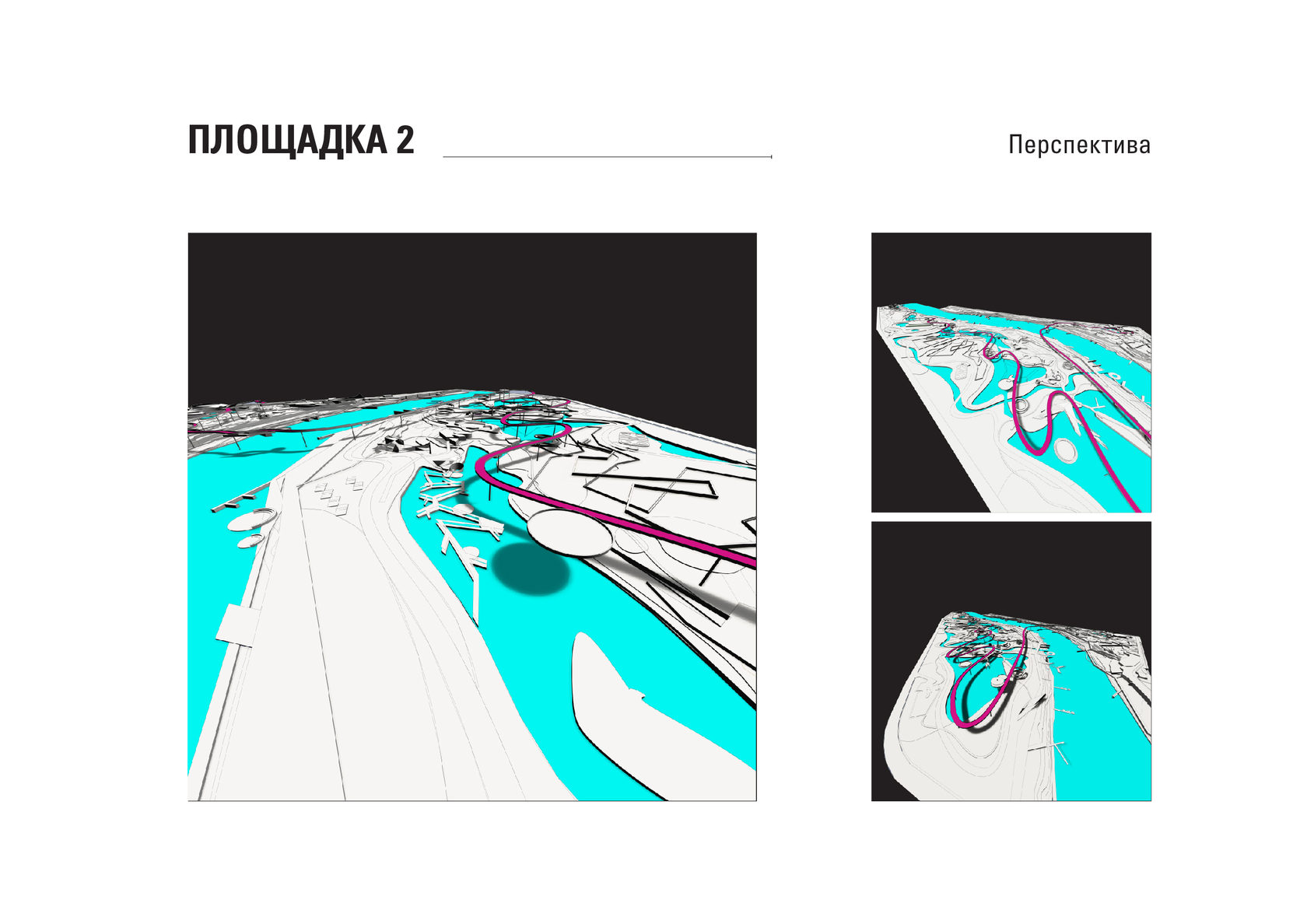 The project consists of two parts - a park in Glazov and the settlement of Idnakar. Plan forms are obtained and structures from ornaments. The park area is connected to the center of Glazov by a pedestrian bridge, which stretches along all the sites of the park, connecting them with each other. Also, artificial reservoirs have been dug out in the park, which are the second artery for movement.