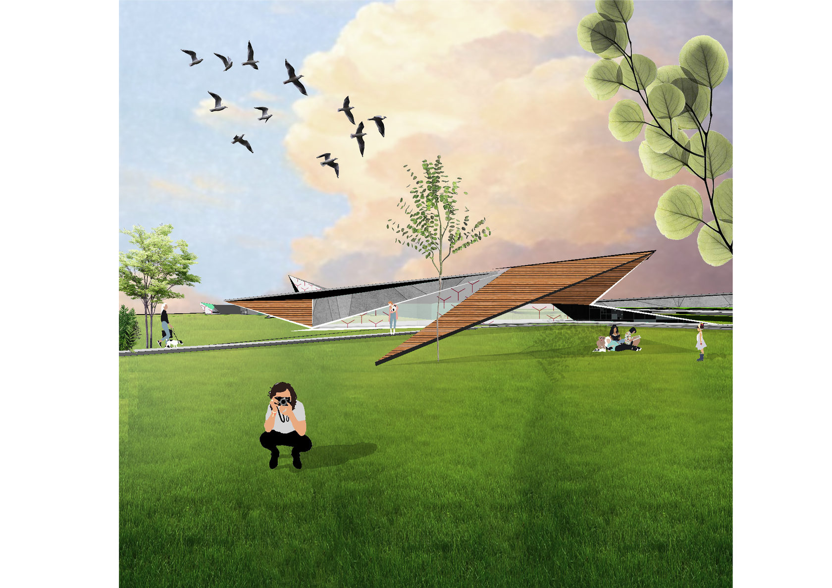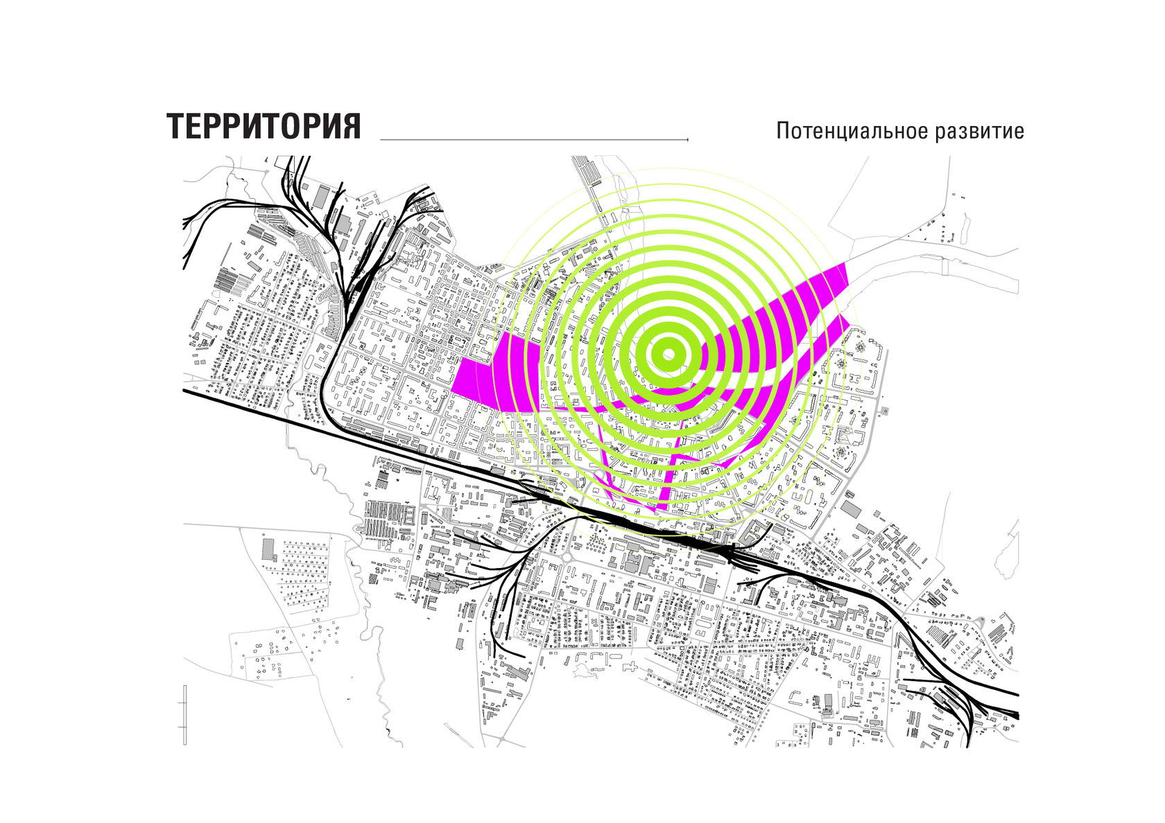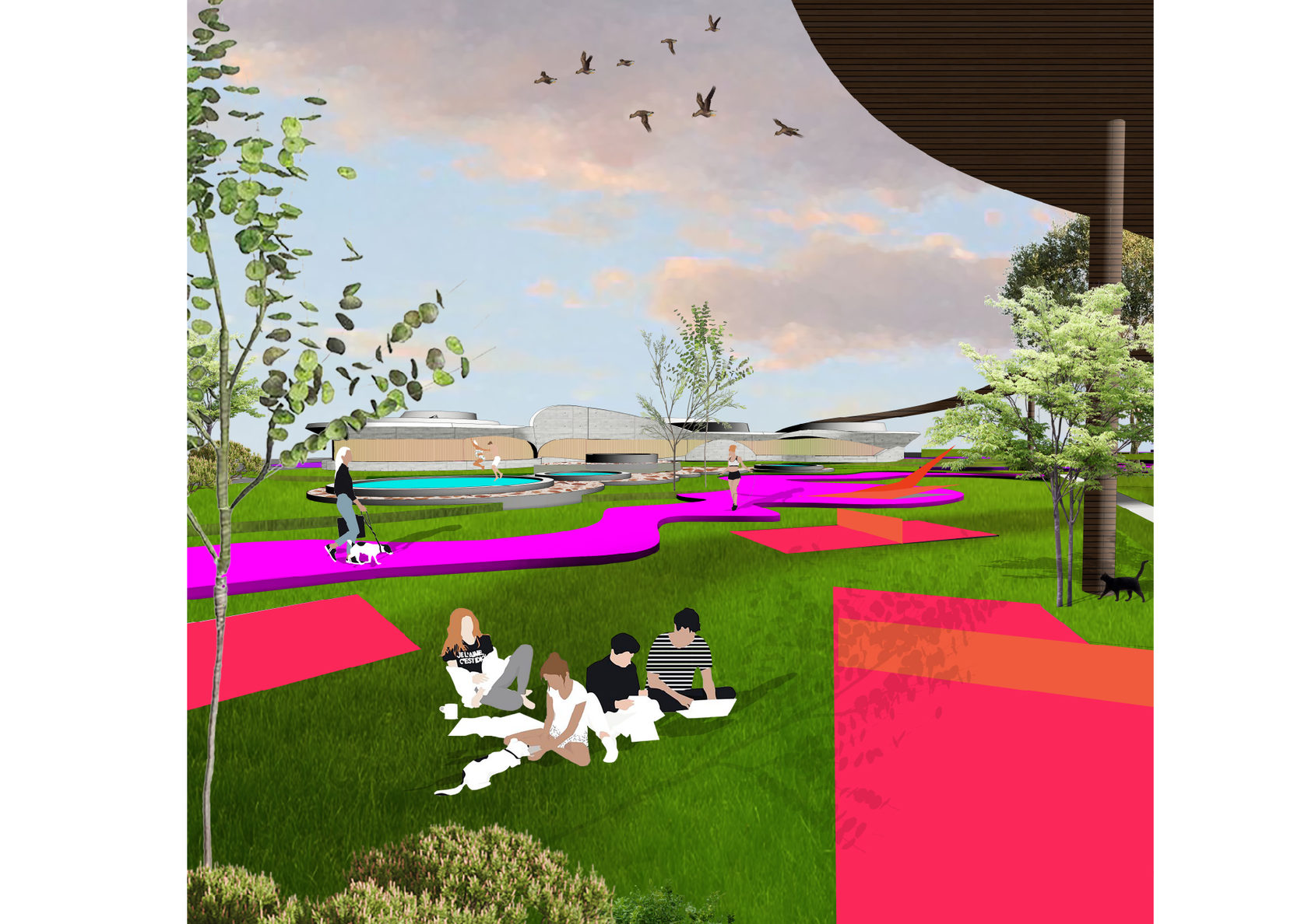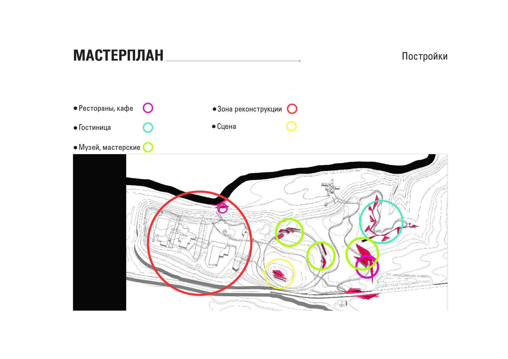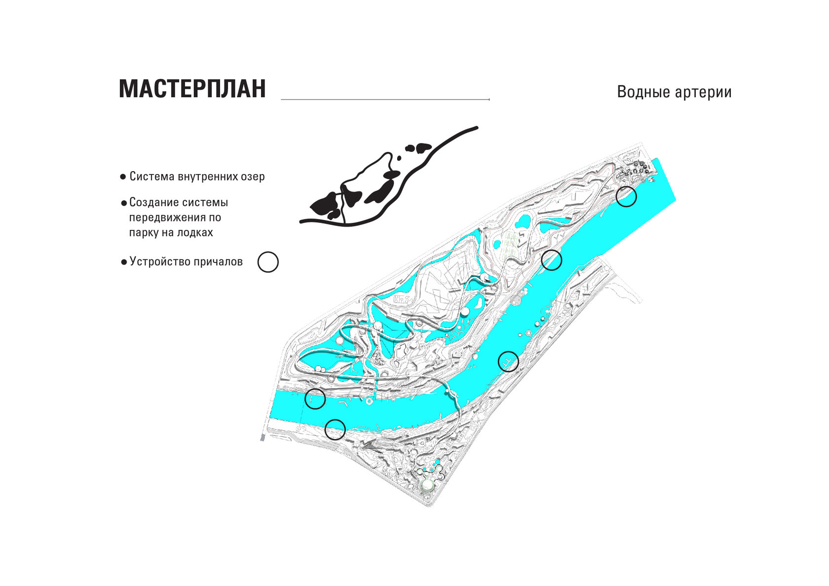 The project consists of two parts - a park in Glazov and the settlement of Idnakar. Plan forms are obtained and structures from ornaments. The park area is connected to the center of Glazov by a pedestrian bridge, which stretches along all the sites of the park, connecting them with each other. Also, artificial reservoirs have been dug out in the park, which are the second artery for movement.
