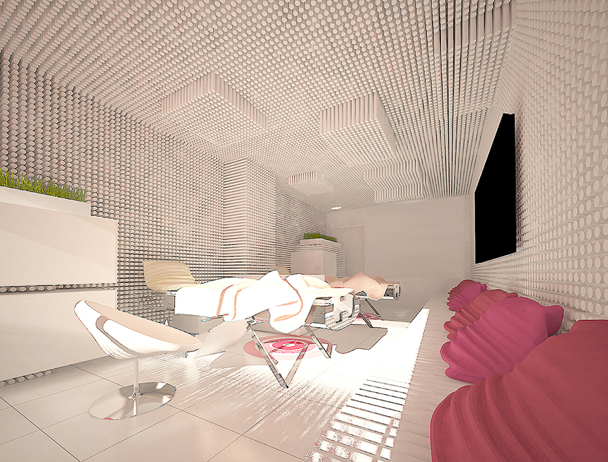 Idea in creation of colourful expressive interior for the hospital. Public spaces and hospital wards are decorated with bright colors with different textures.