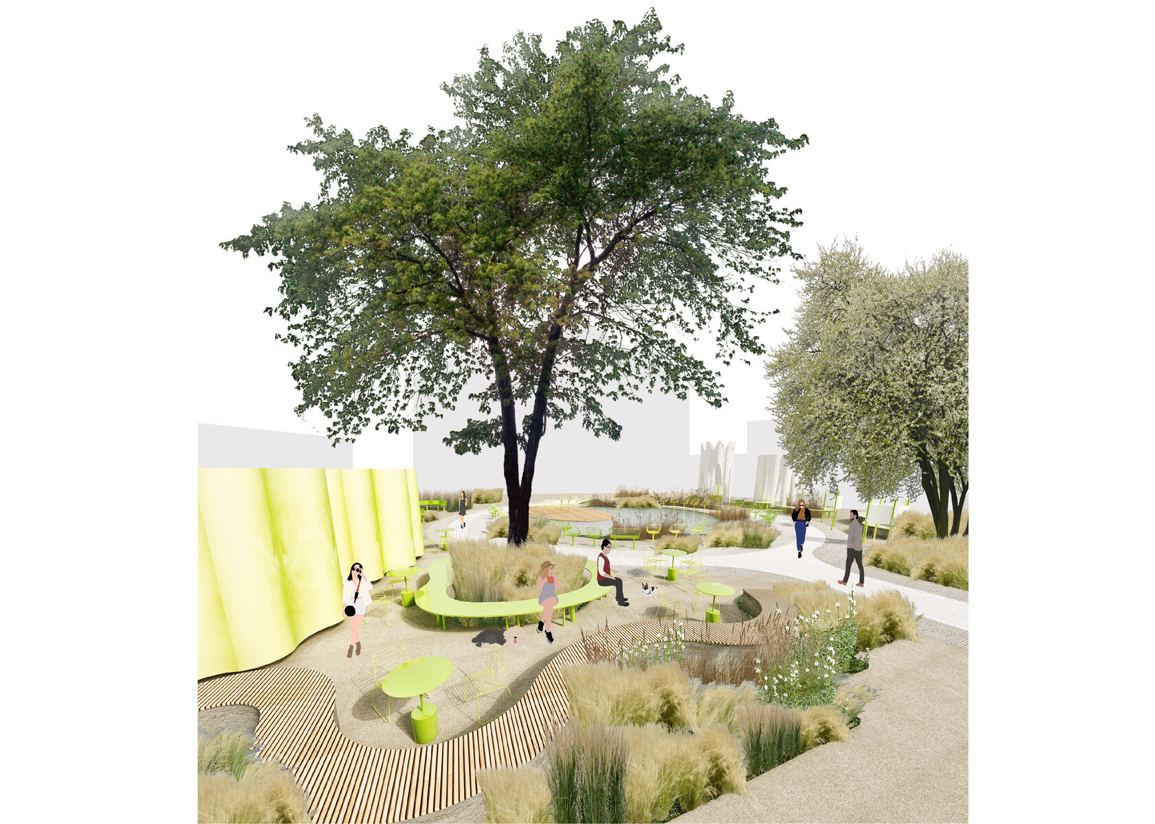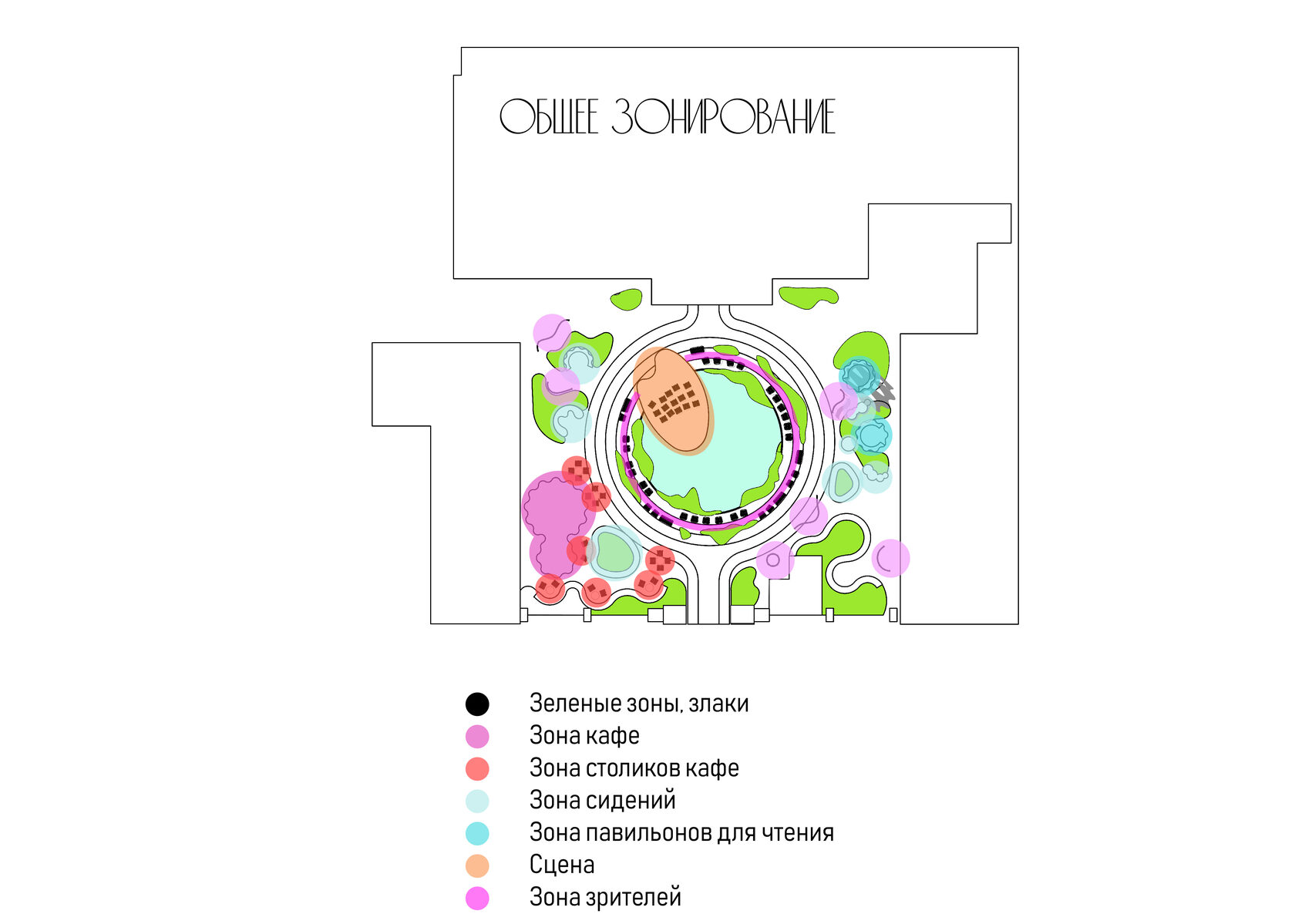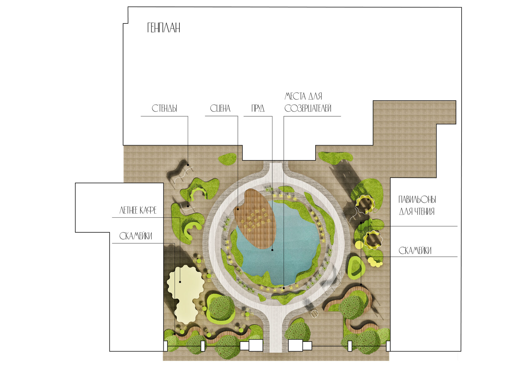 Recreating the garden as a place for meeting and solitude with a book. The basis of the composition is a pond with water lilies, surrounded by created hills with herbs and places for relaxing and reading. The summer cafe is located to the left of the entrance and is a chameleon pavilion with changing colors depending on the viewing angle.