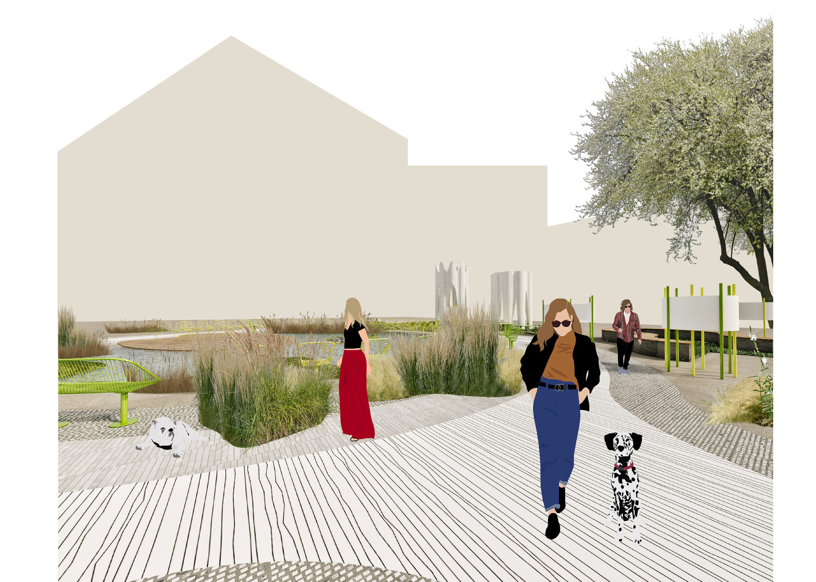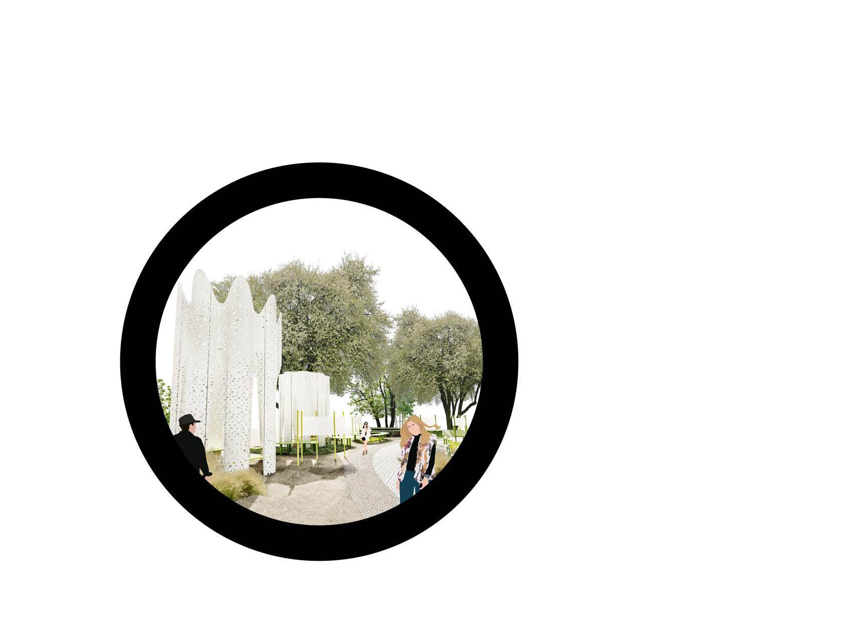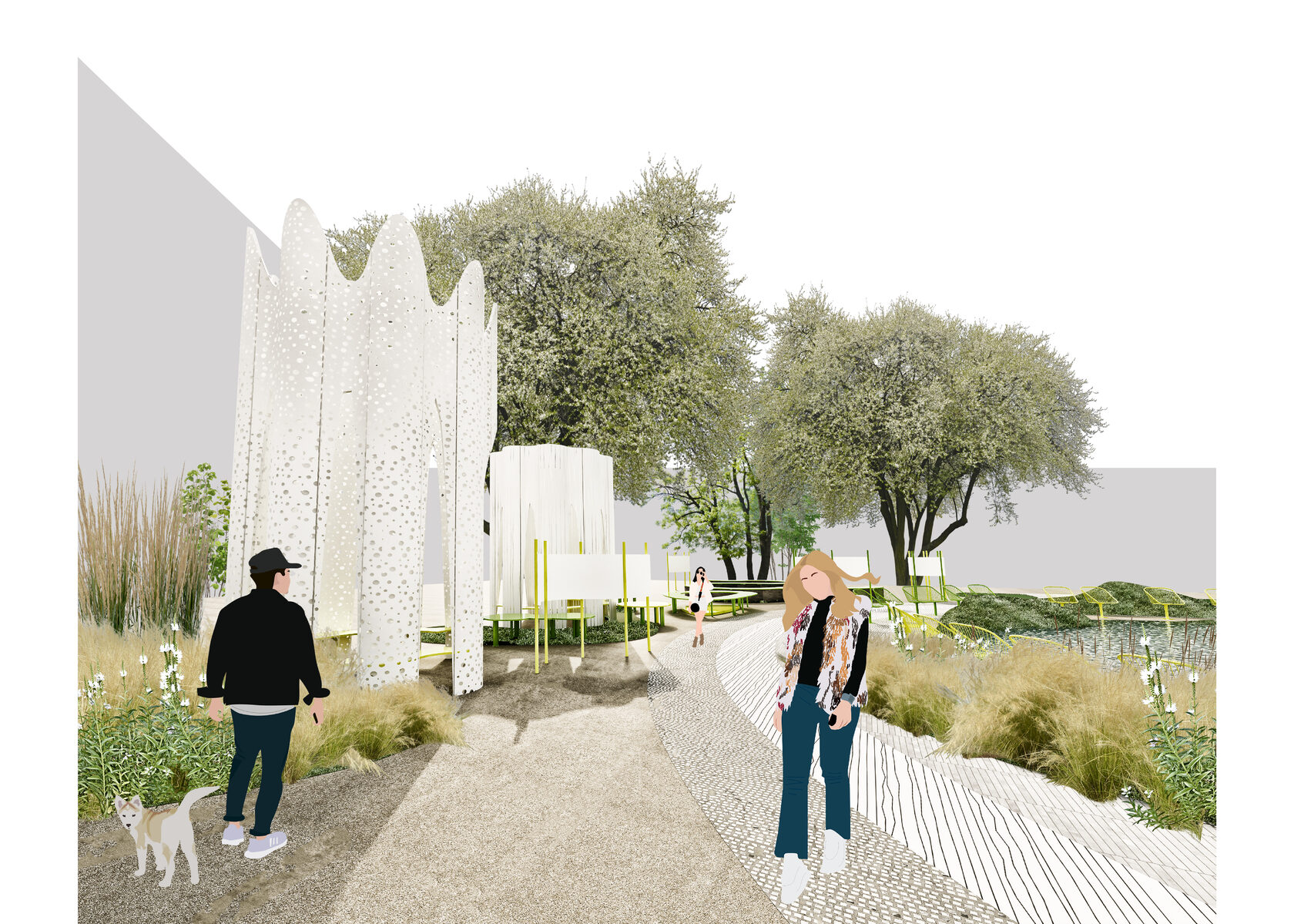 Recreating the garden as a place for meeting and solitude with a book. The basis of the composition is a pond with water lilies, surrounded by created hills with herbs and places for relaxing and reading. The summer cafe is located to the left of the entrance and is a chameleon pavilion with changing colors depending on the viewing angle.