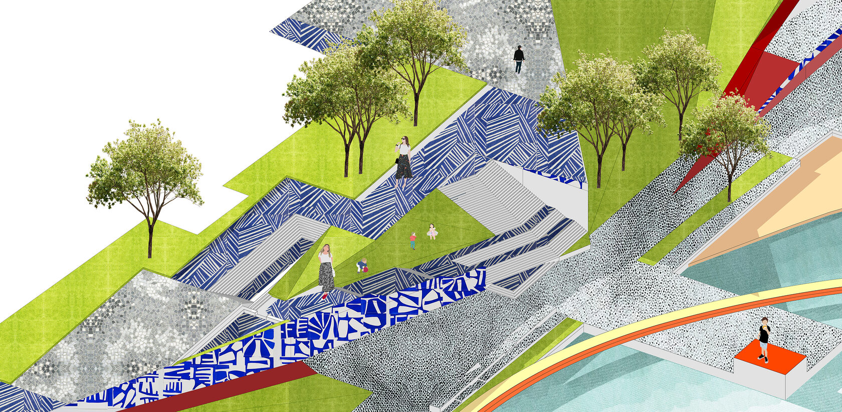 Then there is a gradual descent down the stairs and ramps, providing a barrier-free environment throughout the embankment.