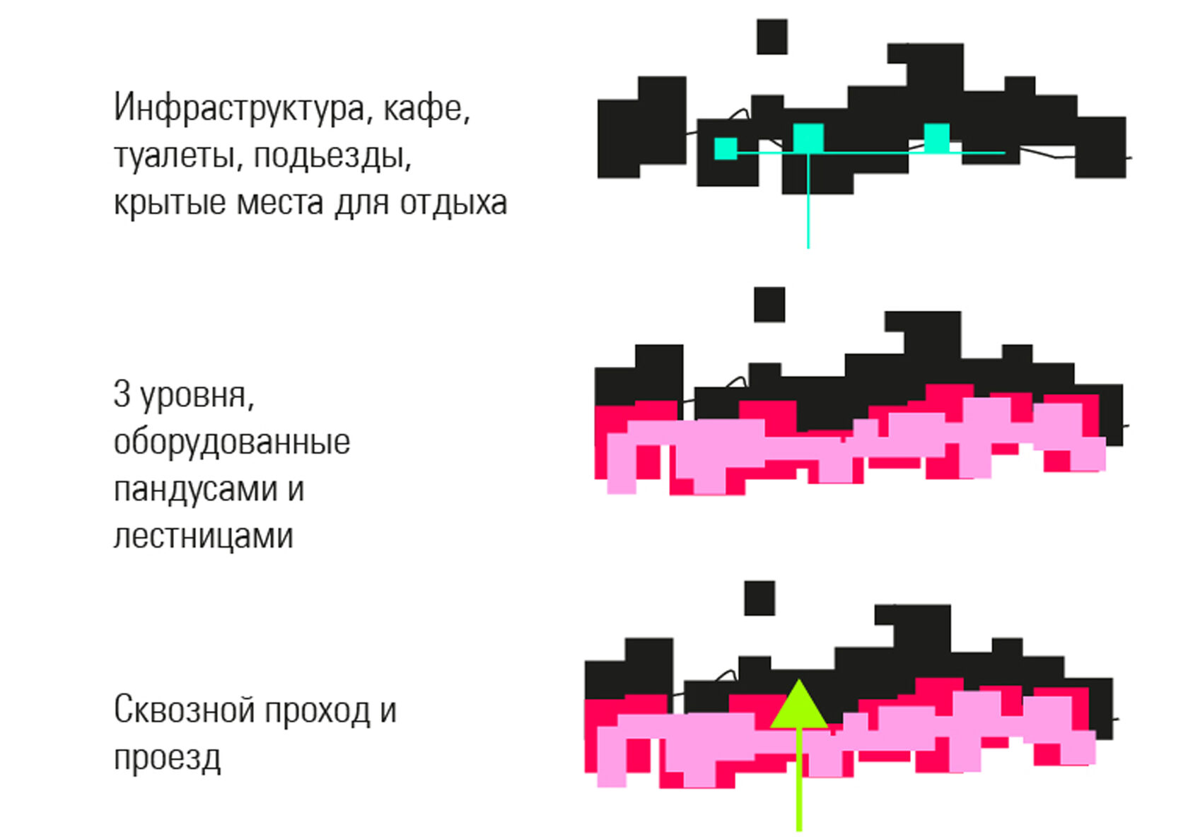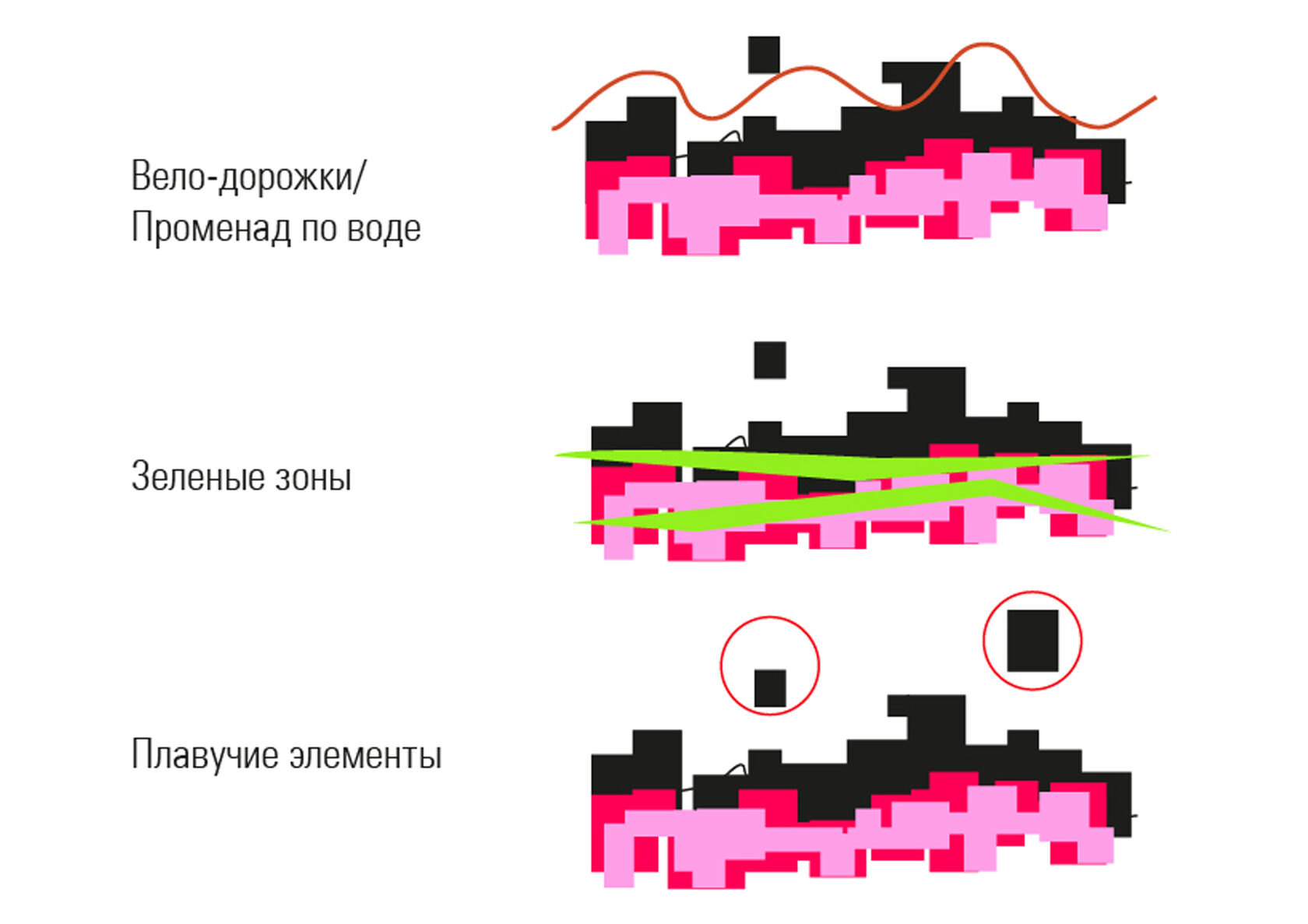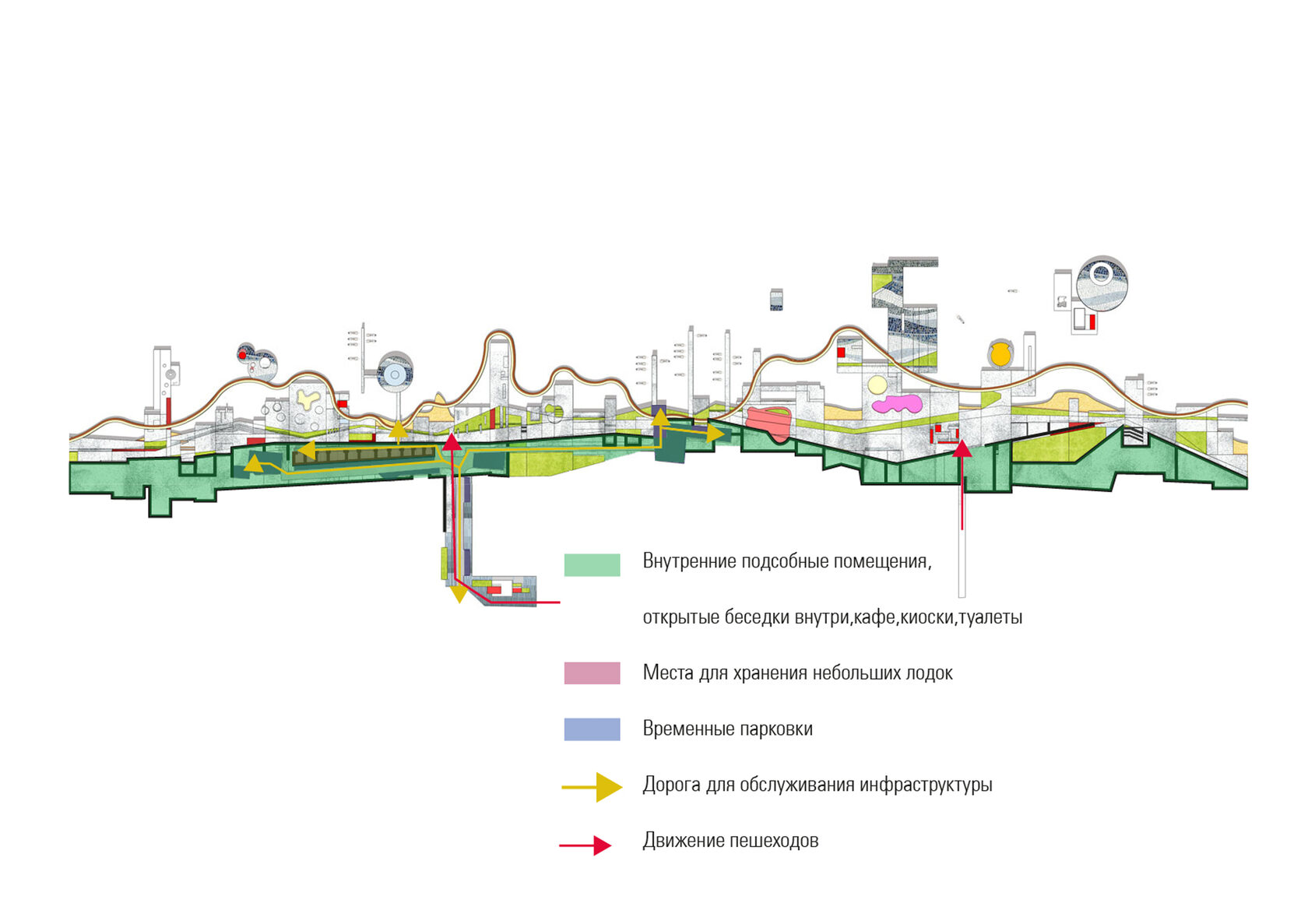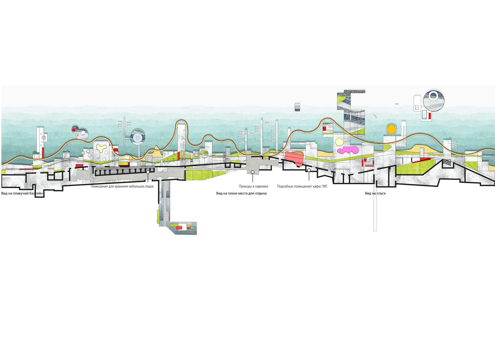 The highest level allows you to freely go up the level from the existing embankments. Beneath it are service driveways and temporary parking lots, as well as serviced infrastructure: cafes, office space, storage for small boats and equipment, covered recreational areas.