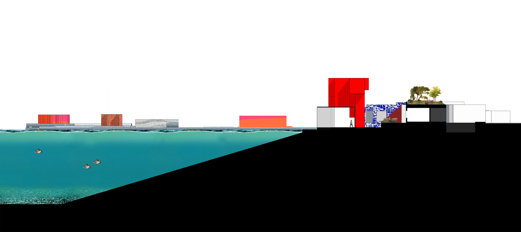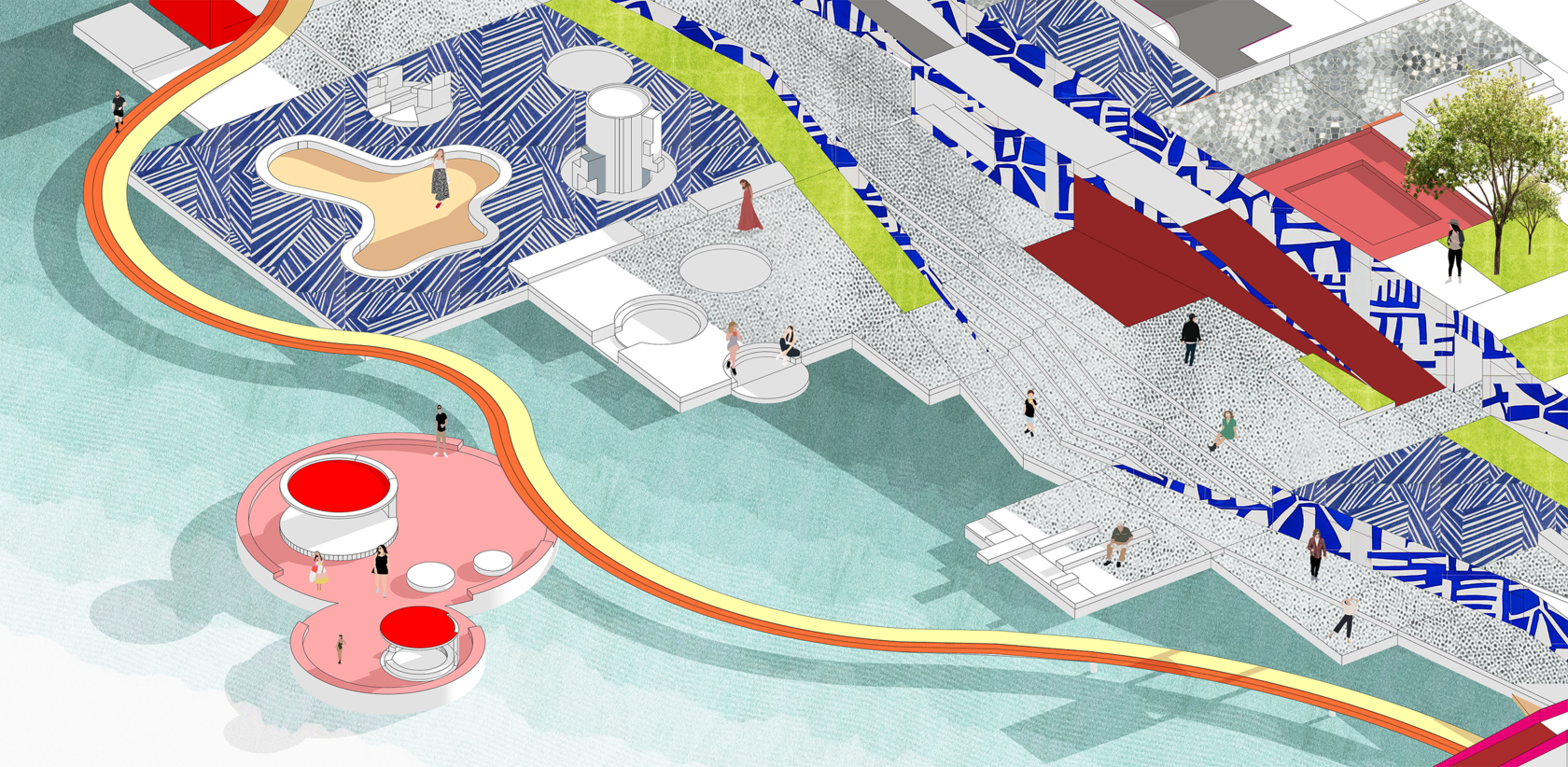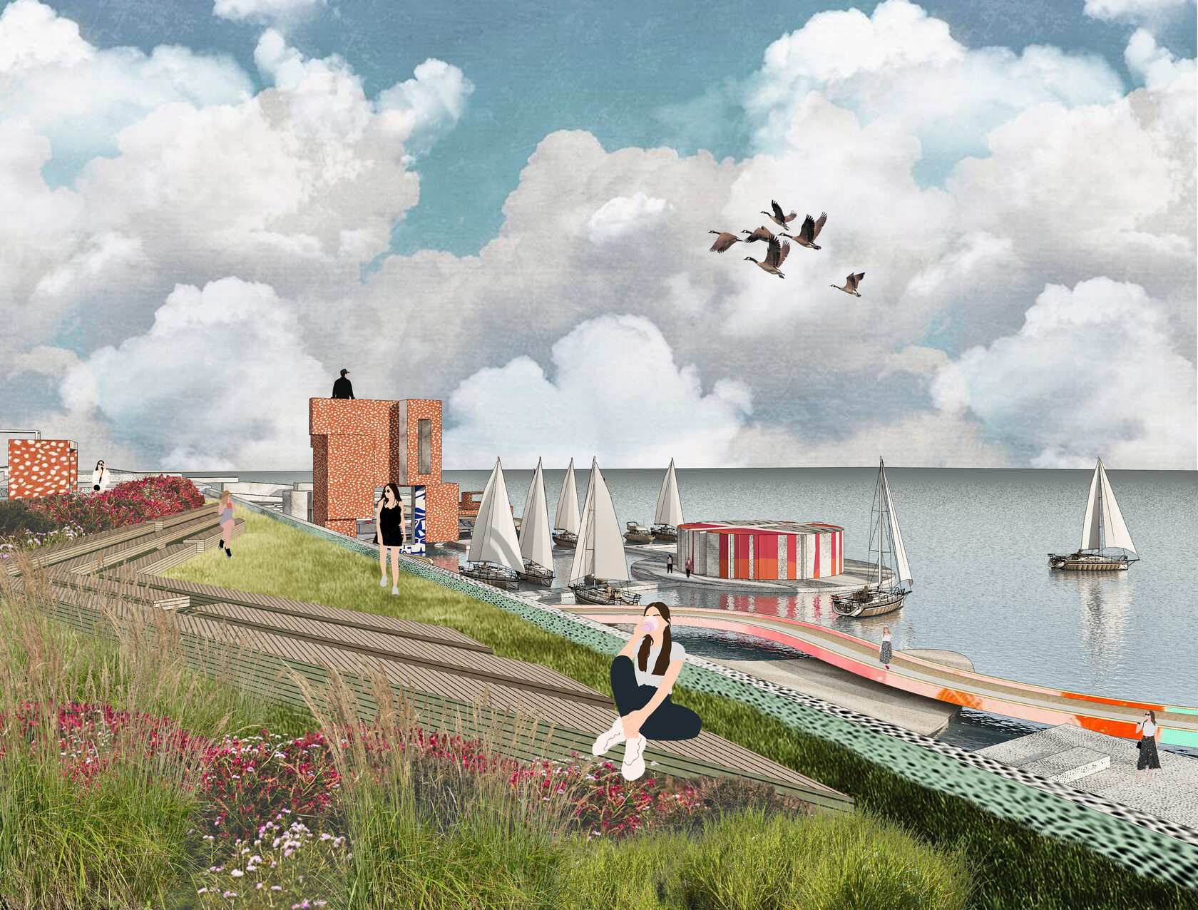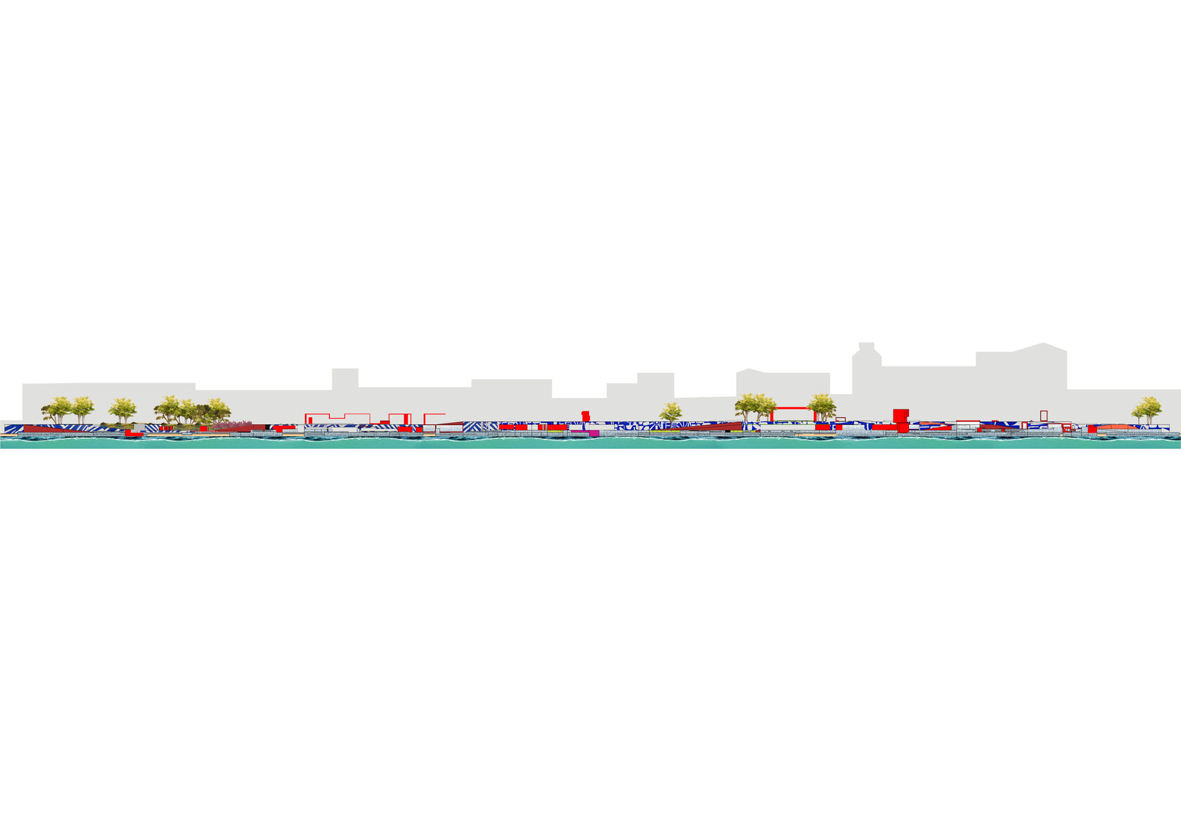 The highest level allows you to freely go up the level from the existing embankments. Beneath it are service driveways and temporary parking lots, as well as serviced infrastructure: cafes, office space, storage for small boats and equipment, covered recreational areas.