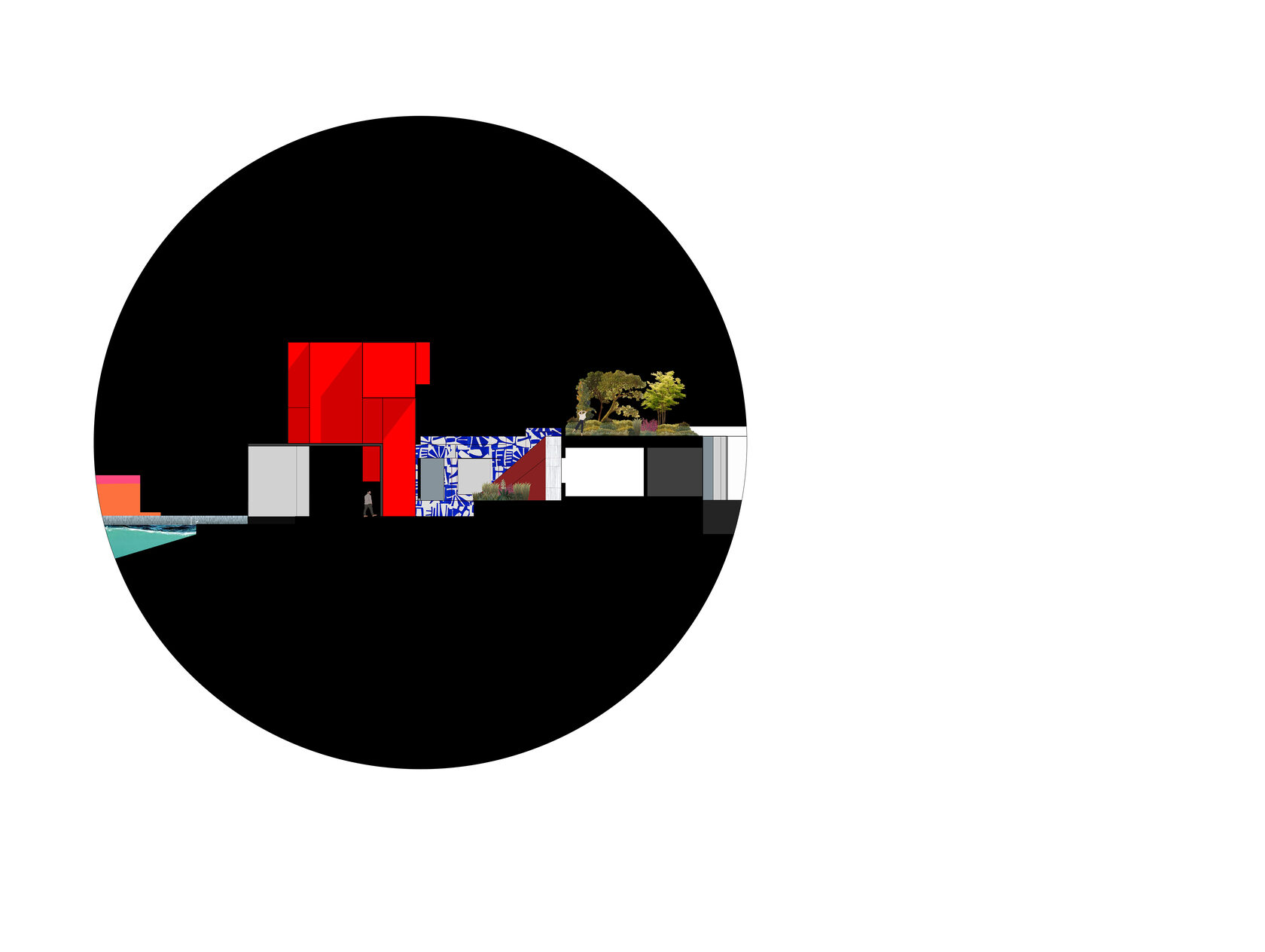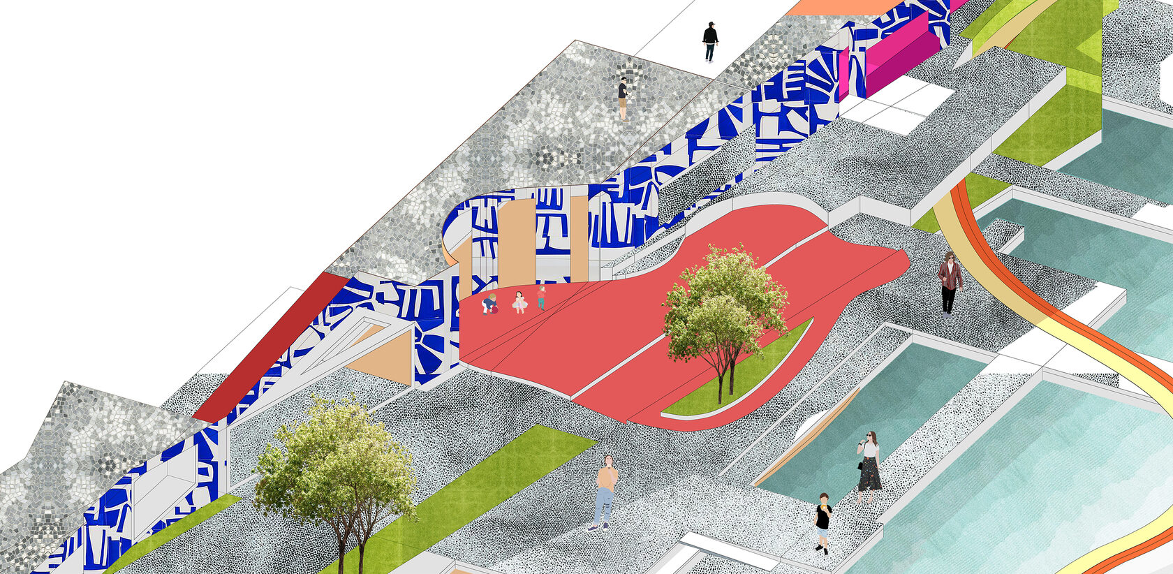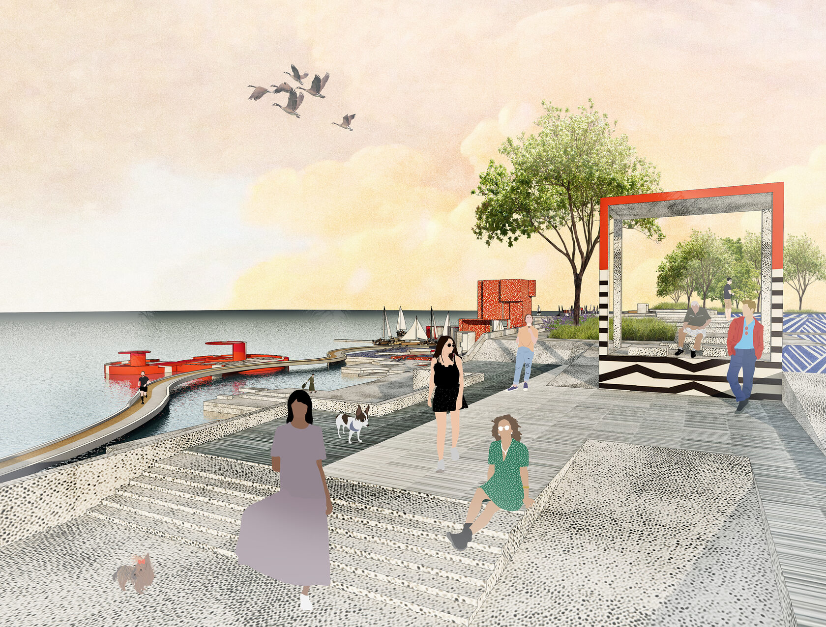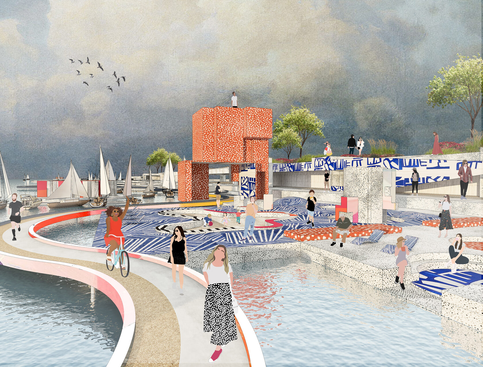 The highest level allows you to freely go up the level from the existing embankments. Beneath it are service driveways and temporary parking lots, as well as serviced infrastructure: cafes, office space, storage for small boats and equipment, covered recreational areas.