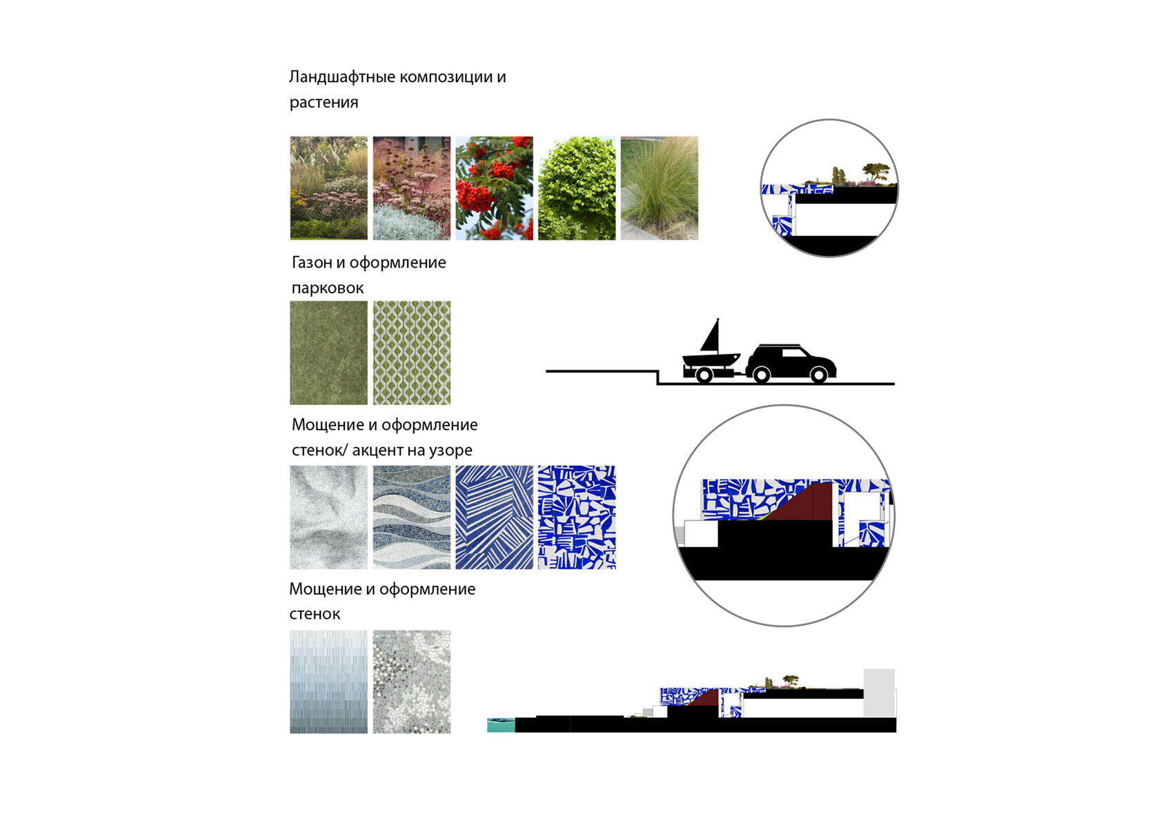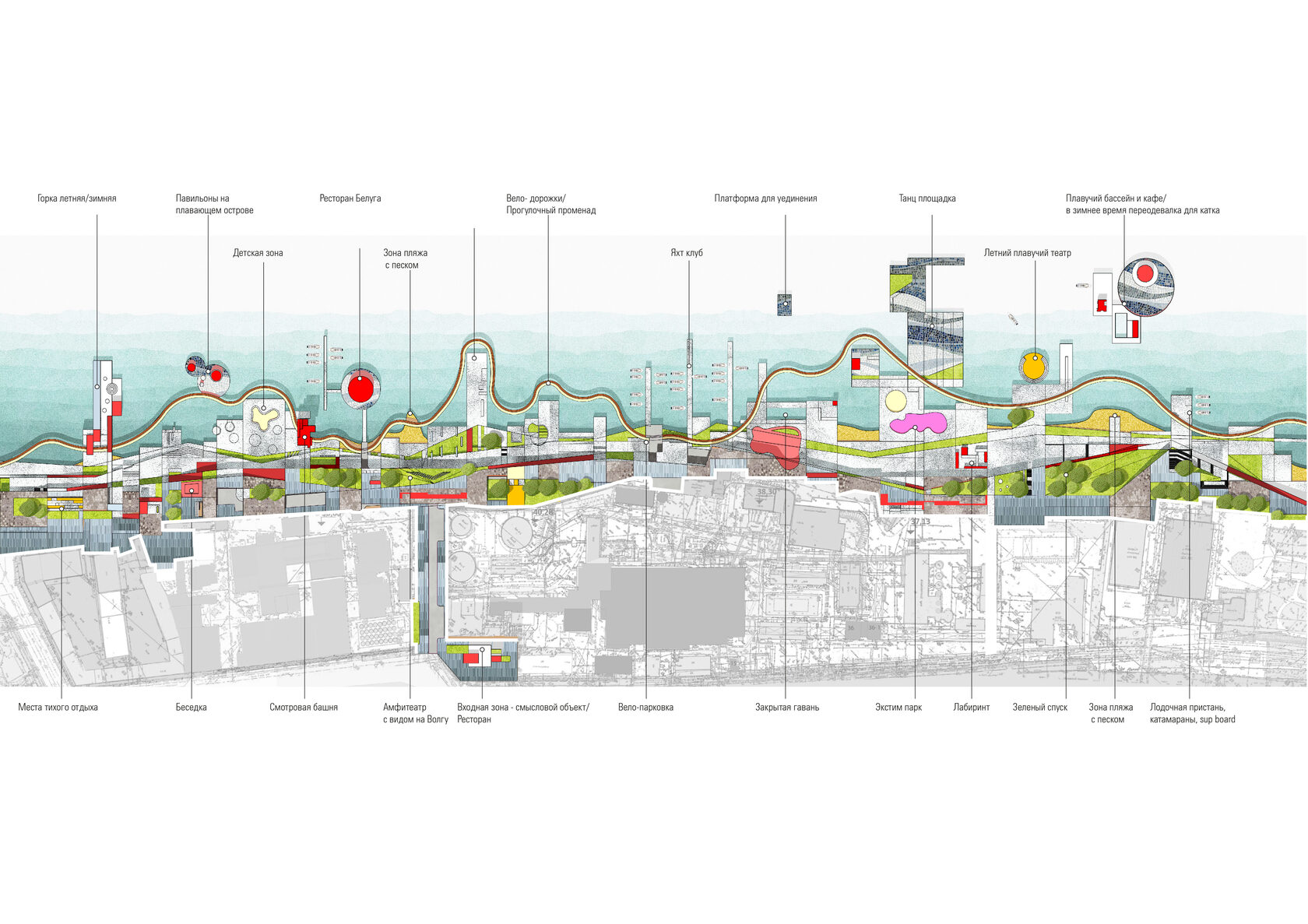 The main idea of project is the creation of a multi-level system, approaching the water and docking with the embankment at level 37.150 to discover thereby the best coverage for the upper terraces and the roof for the premises of the lower floor, performing temporary, service and recreational functions.