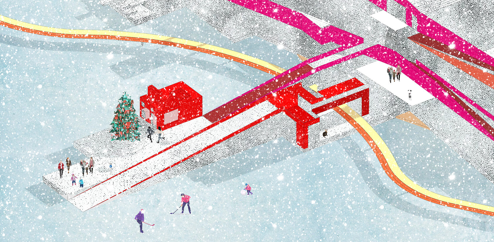 Some parts of the embankment are floating, they can be docked to the main body of the embankment, this is both a summer theater and a floating pool with a cafe. Bike lanes: An interesting element is the bike path and the promenade, located on the water and having a flexible shape.