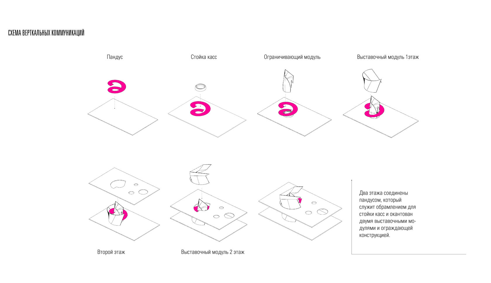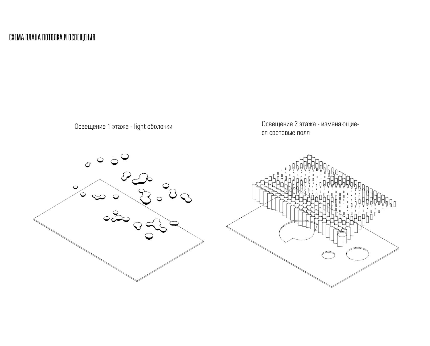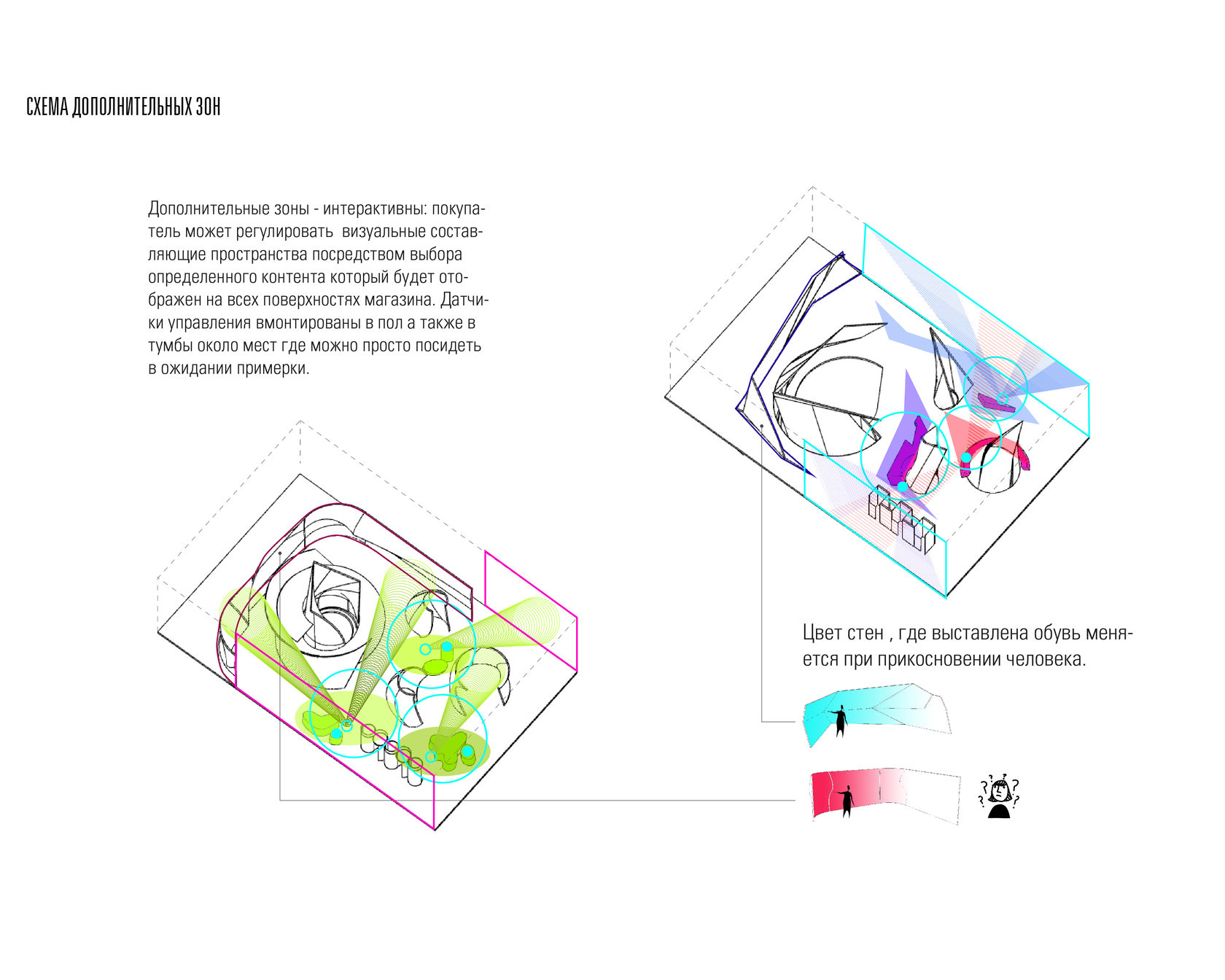 The two floors are connected by a ramp that serves as a frame for the cash desk and is framed by two exhibition modules and a building envelope. Additional zones - interactive: the buyer can adjust the visual components of the space by choosing specific content that will be displayed on all surfaces of the store. Control sensors are built into the floor, as well as in cabinets near places where you can just sit while waiting for the fitting.