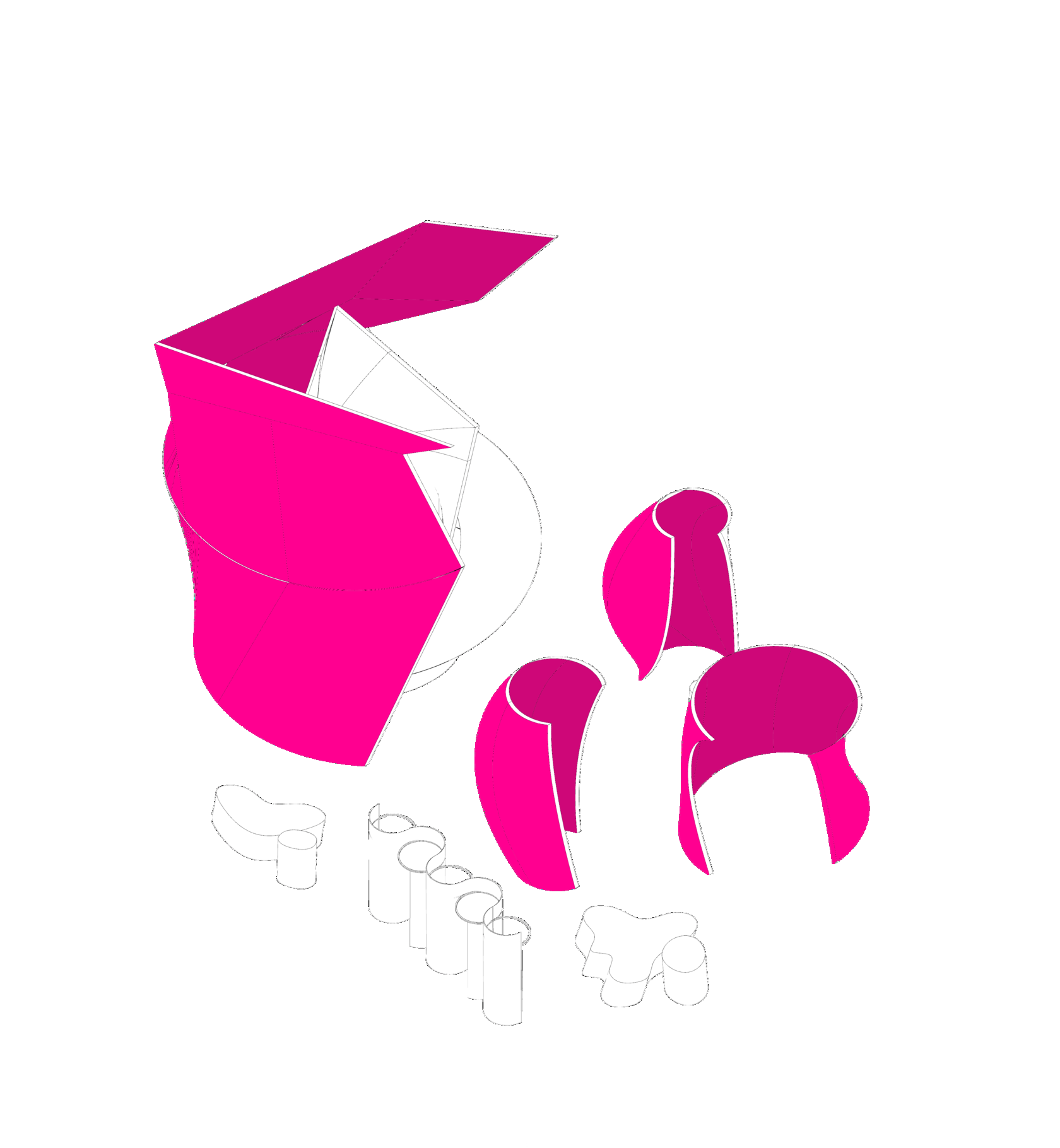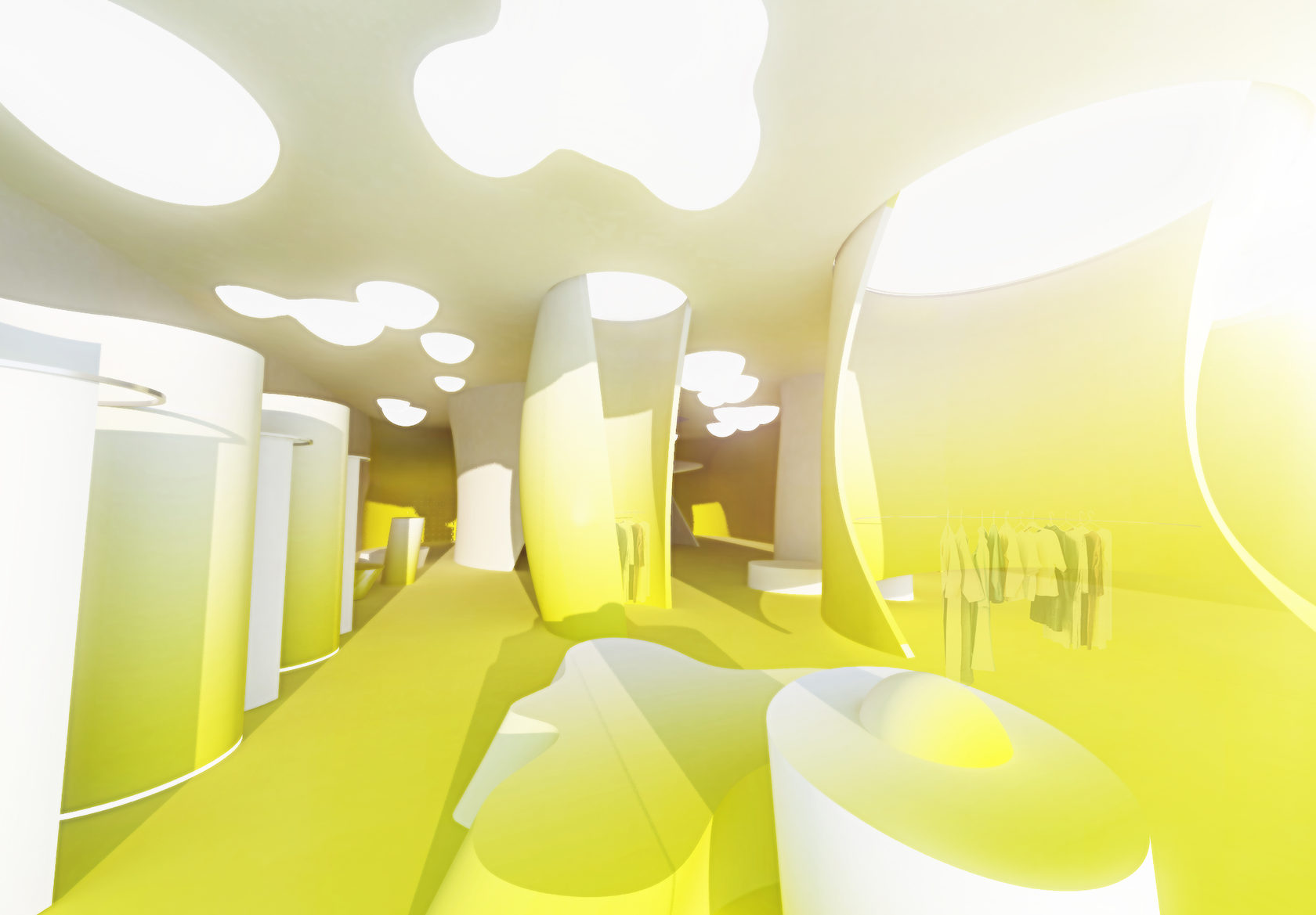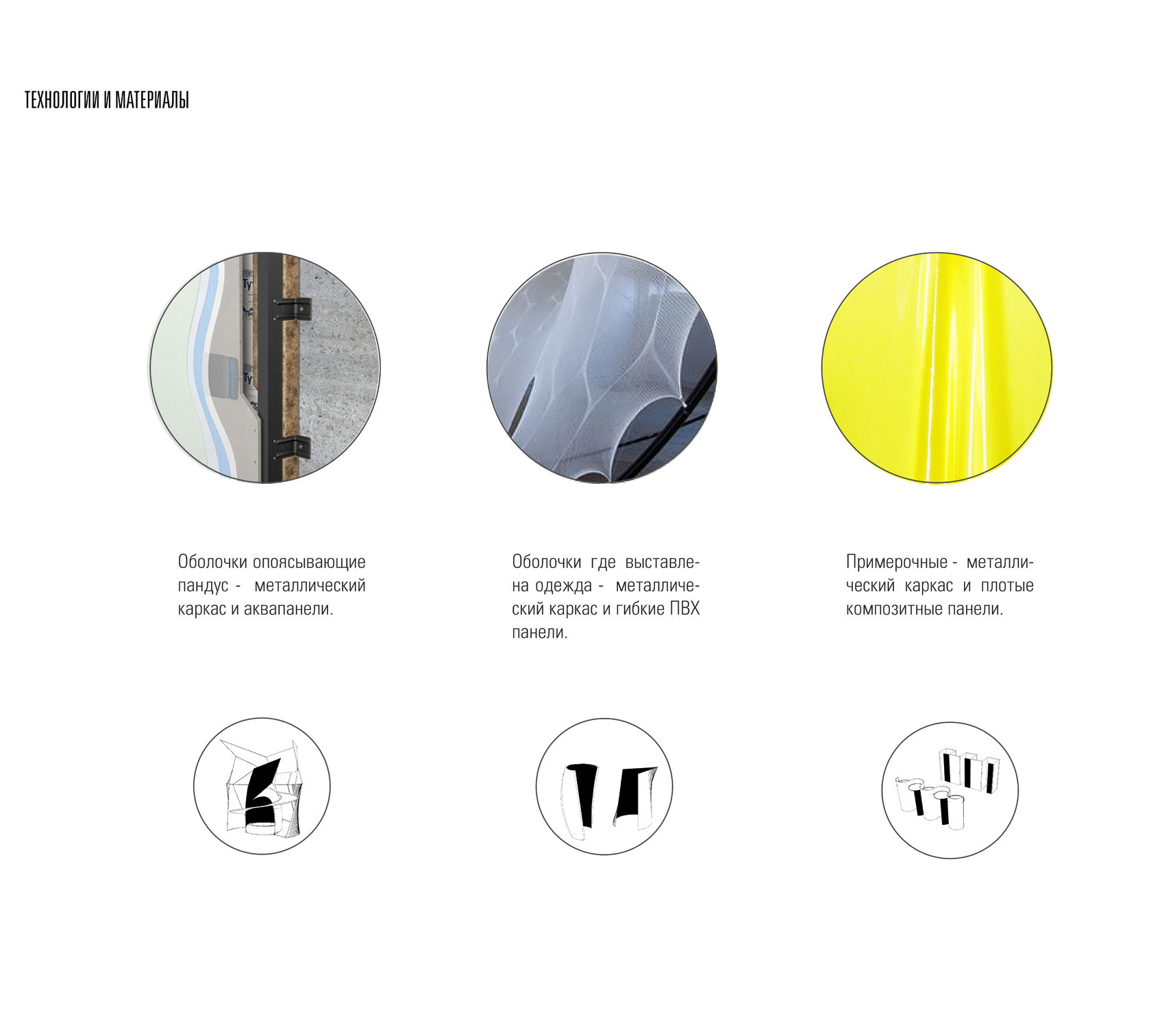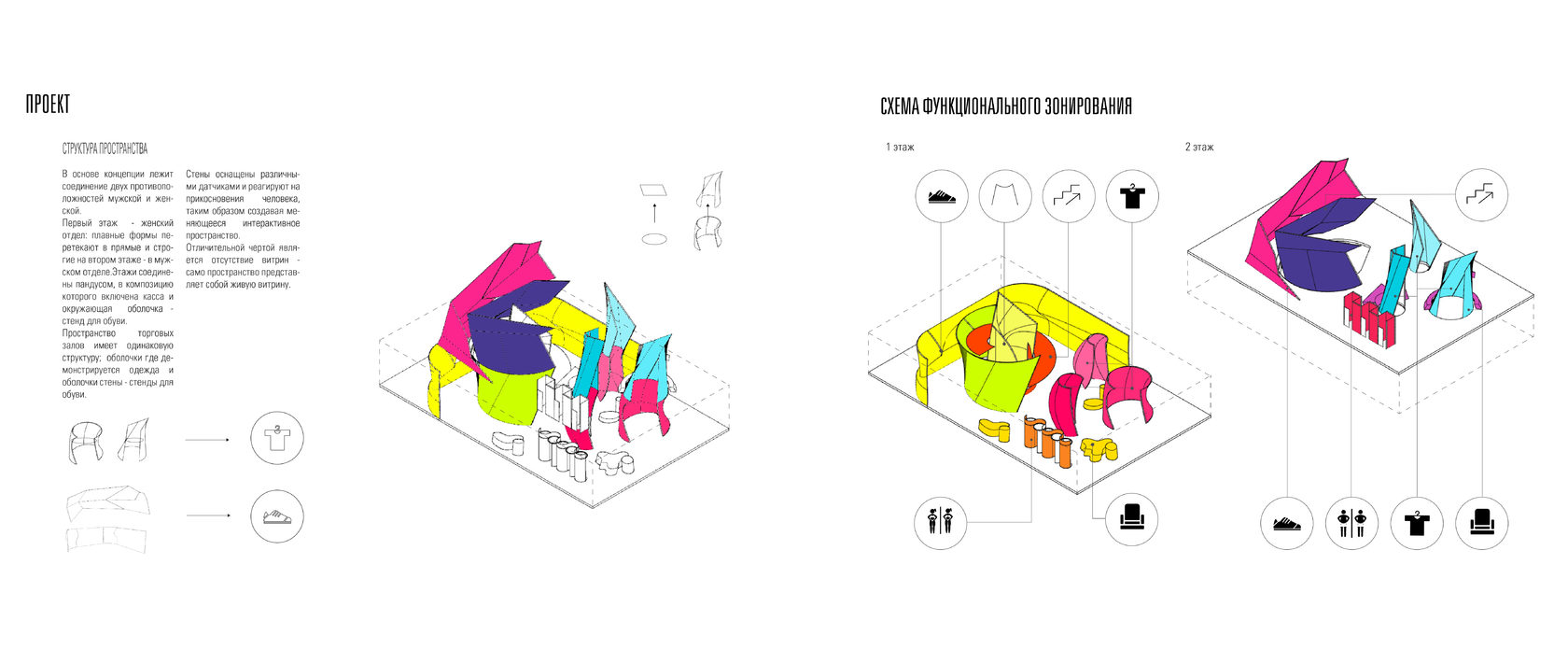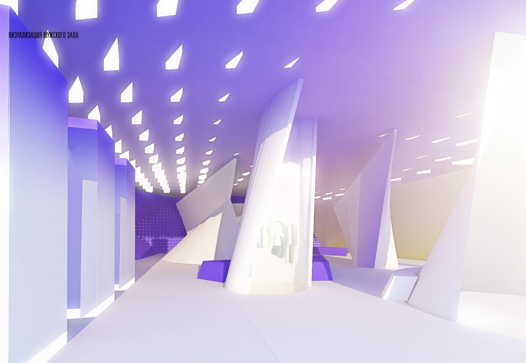 The trading floor space has the same structure; shells where clothes are displayed and wall shells - stands for shoes.its. The walls are equipped with various sensors and respond to human touch, thus creating a changing interactive space. A distinctive feature is the absence of showcases - the space itself is a living showcase.