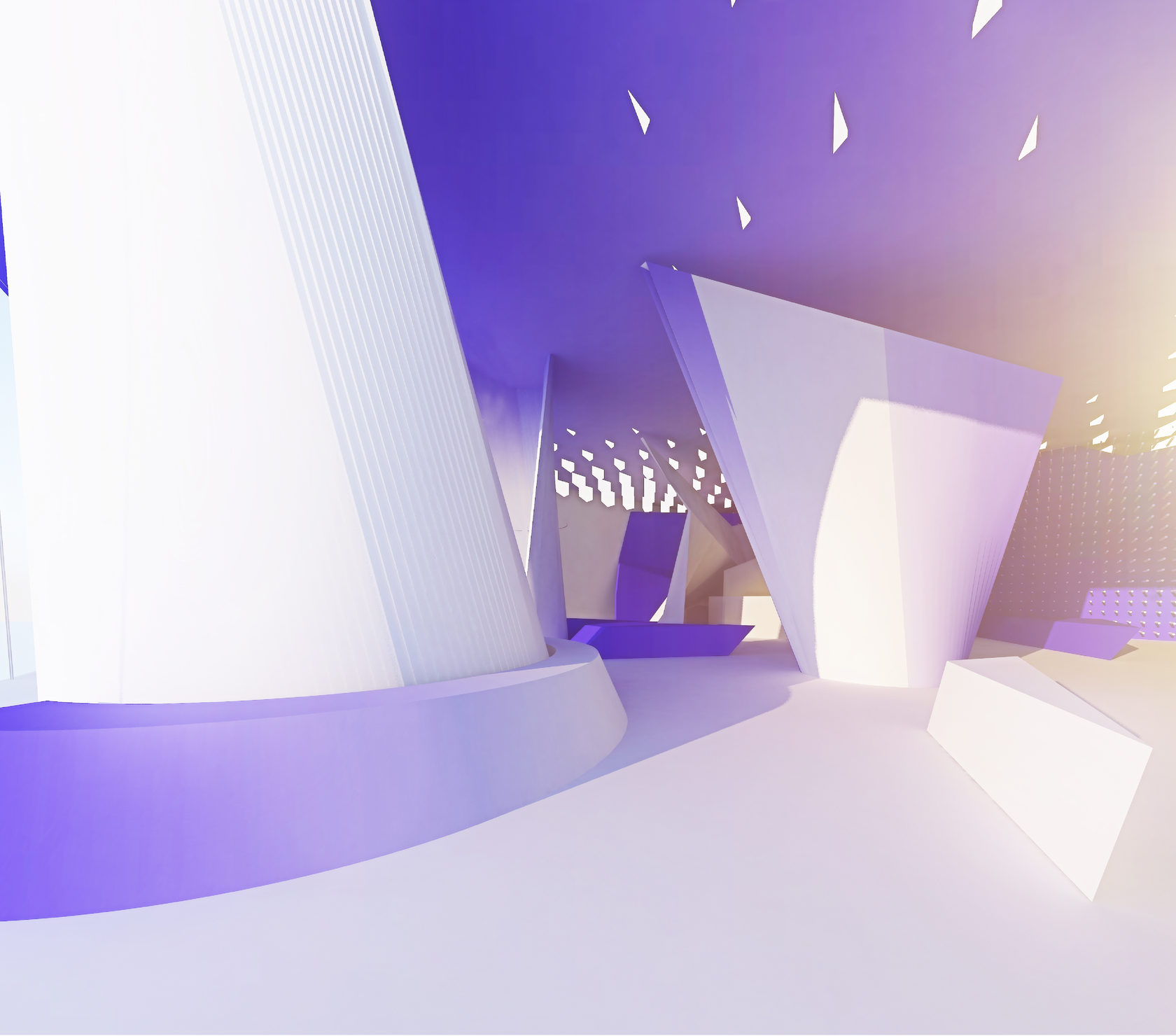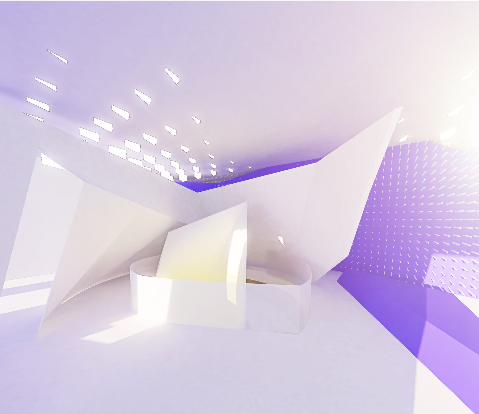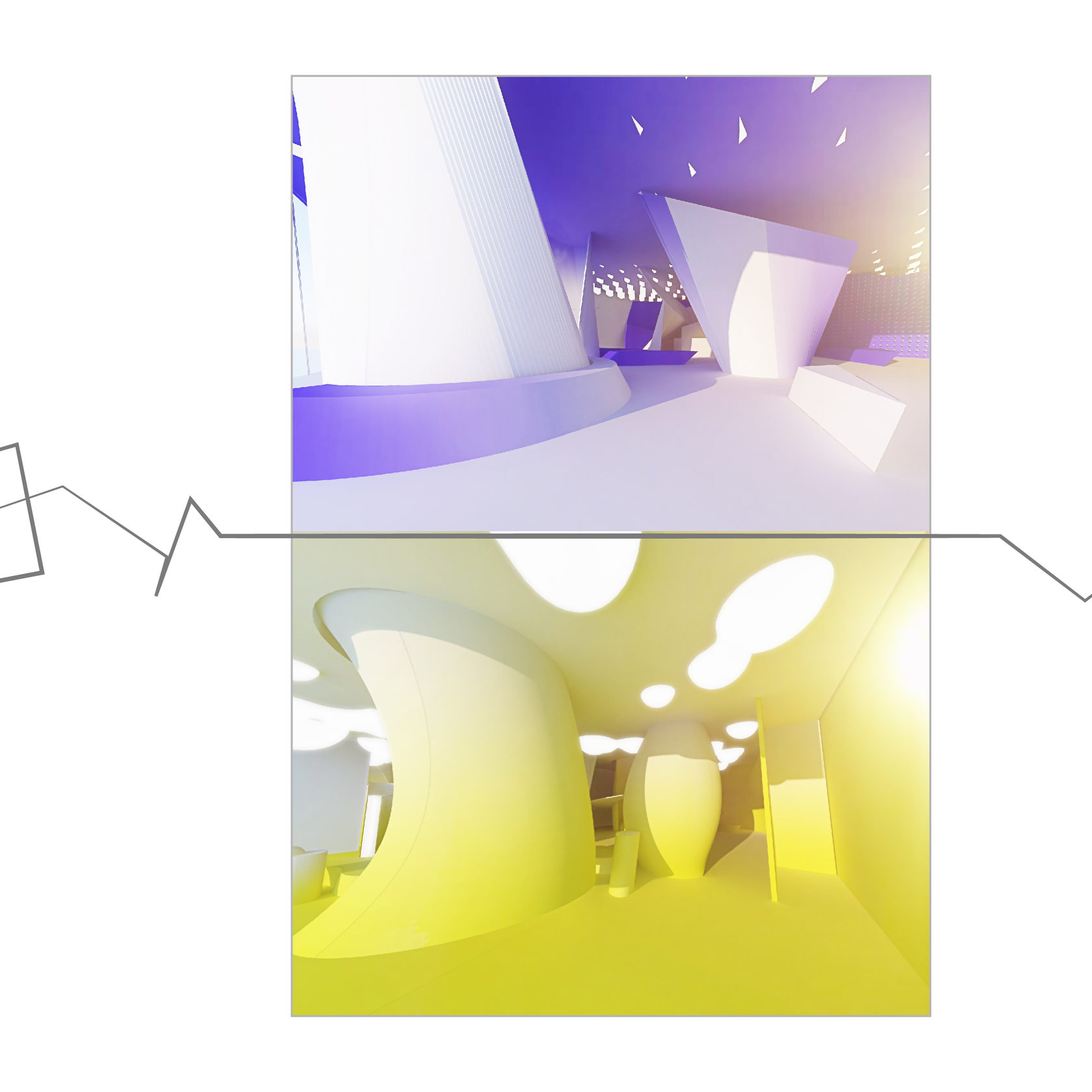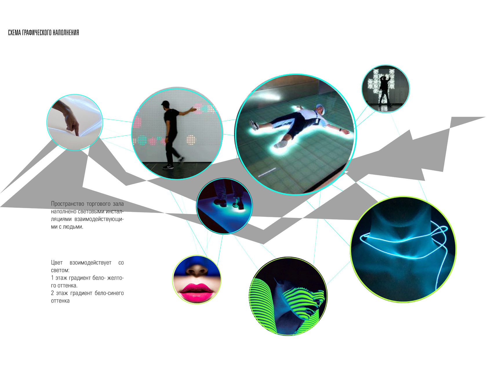The color of the walls where the shoes are displayed changes when a person touches them. The space of the trading floor is filled with light installations interacting with people. Color interacts with light: 1st floor gradient white-yellow hue. 2nd floor white-blue gradient