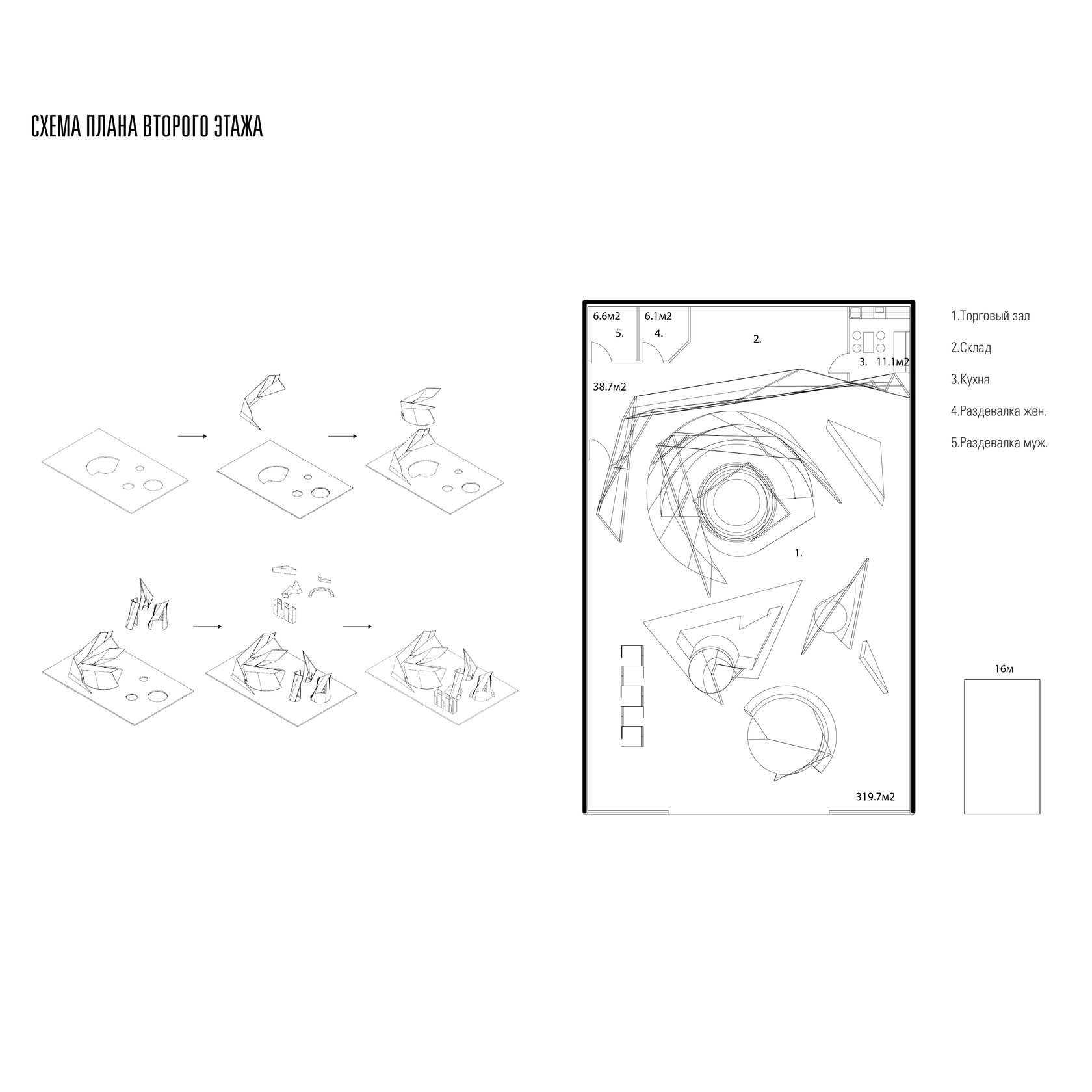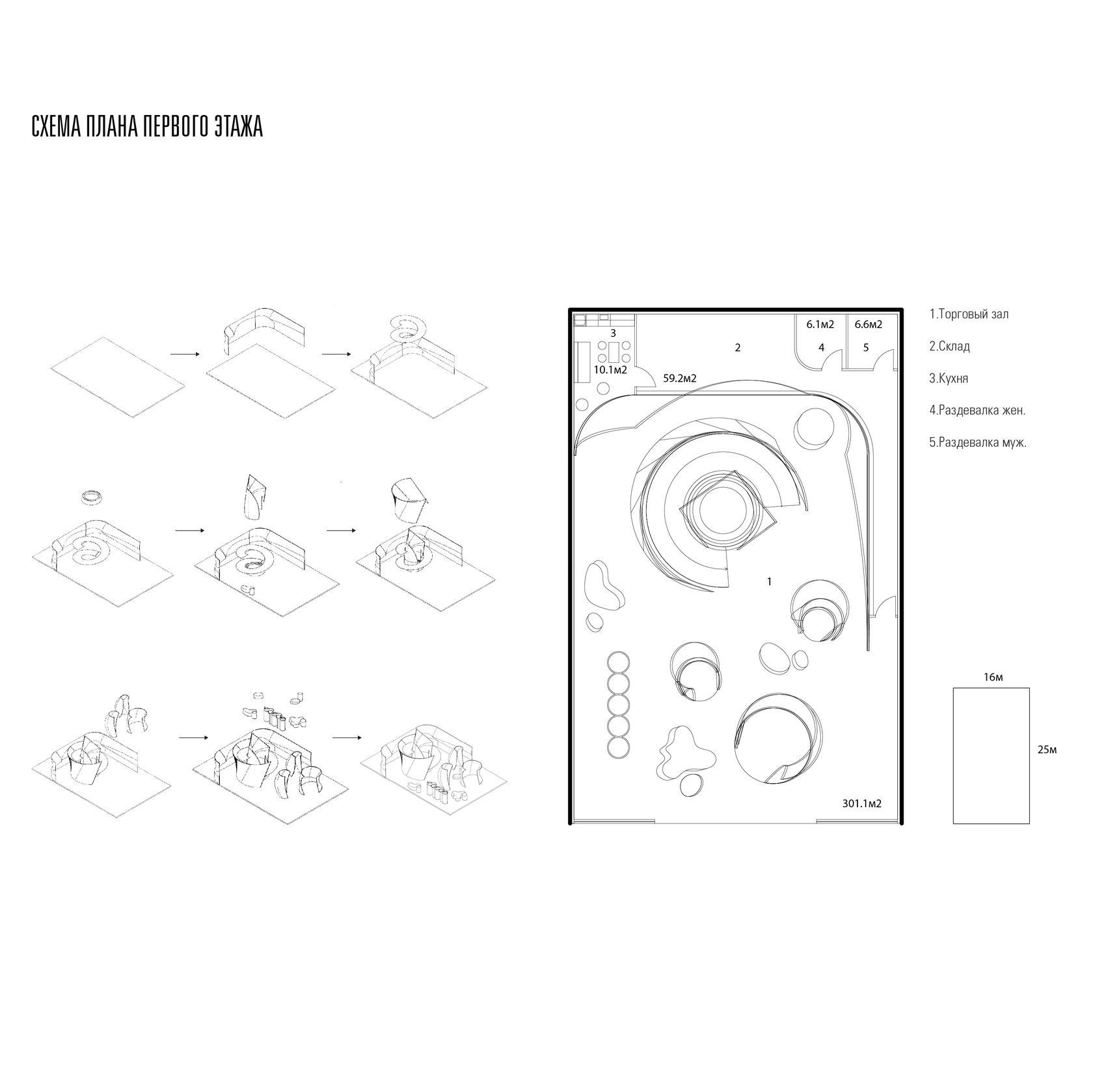 The concept is based on the combination of two opposites of male and female. The first floor is the women's department: smooth forms flow into straight and strict ones on the second floor - in the men's department.