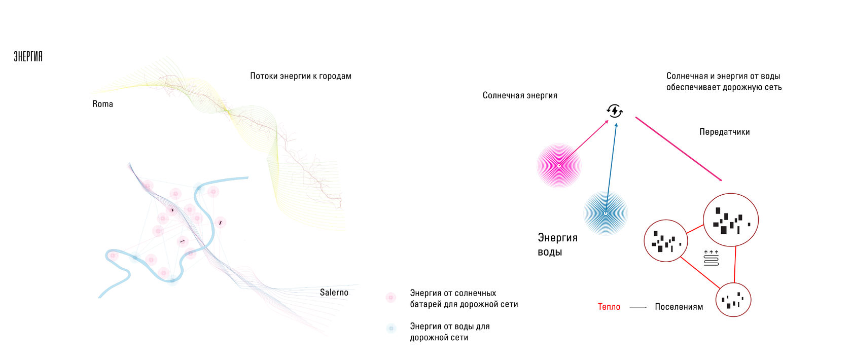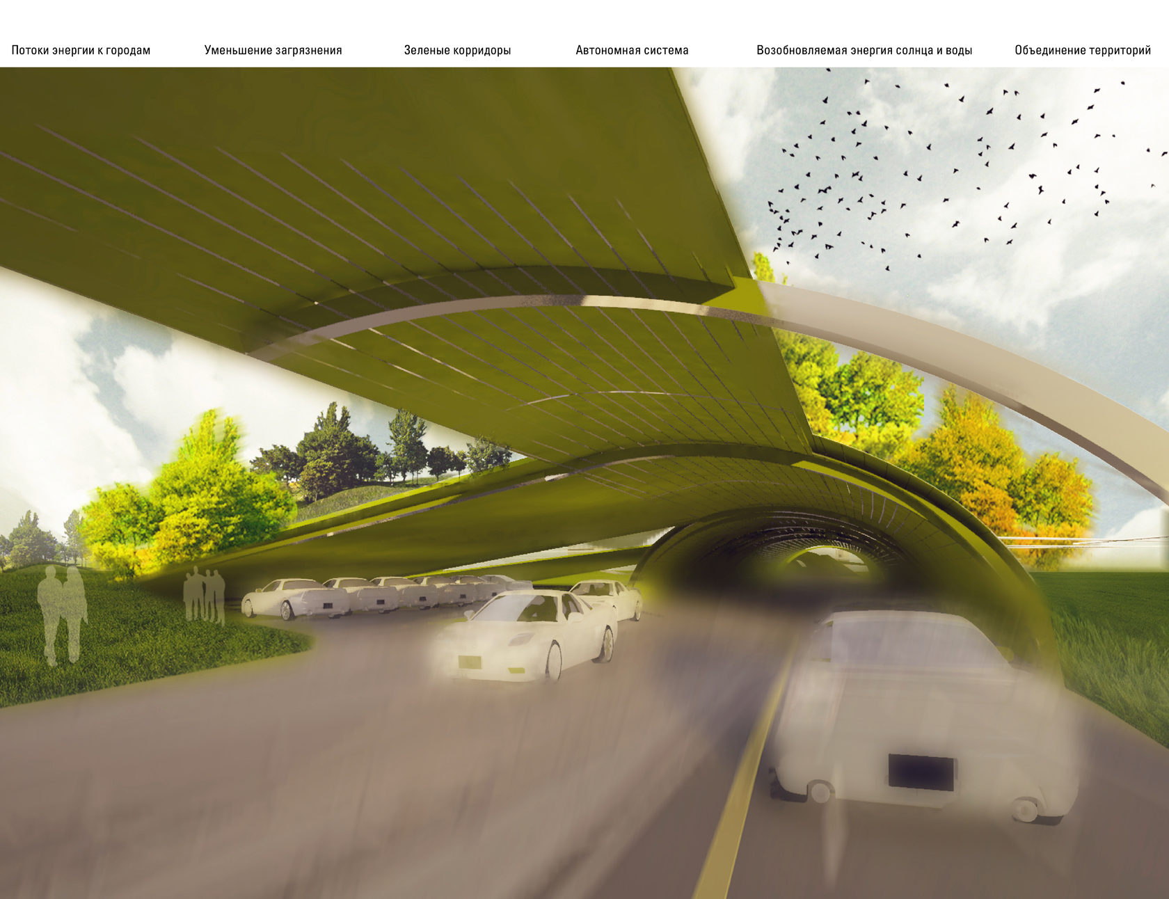 Creation of environmentally friendly roads that ensure the safety of the system operating in the territory with surrounding territories. Program: The use of a new type of road that does not pollute the air and is silent, allows you to create a green corridor connecting two parts of agricultural fields. Energy flows from roads to settlements (heat received from radiators on the road goes to settlements).