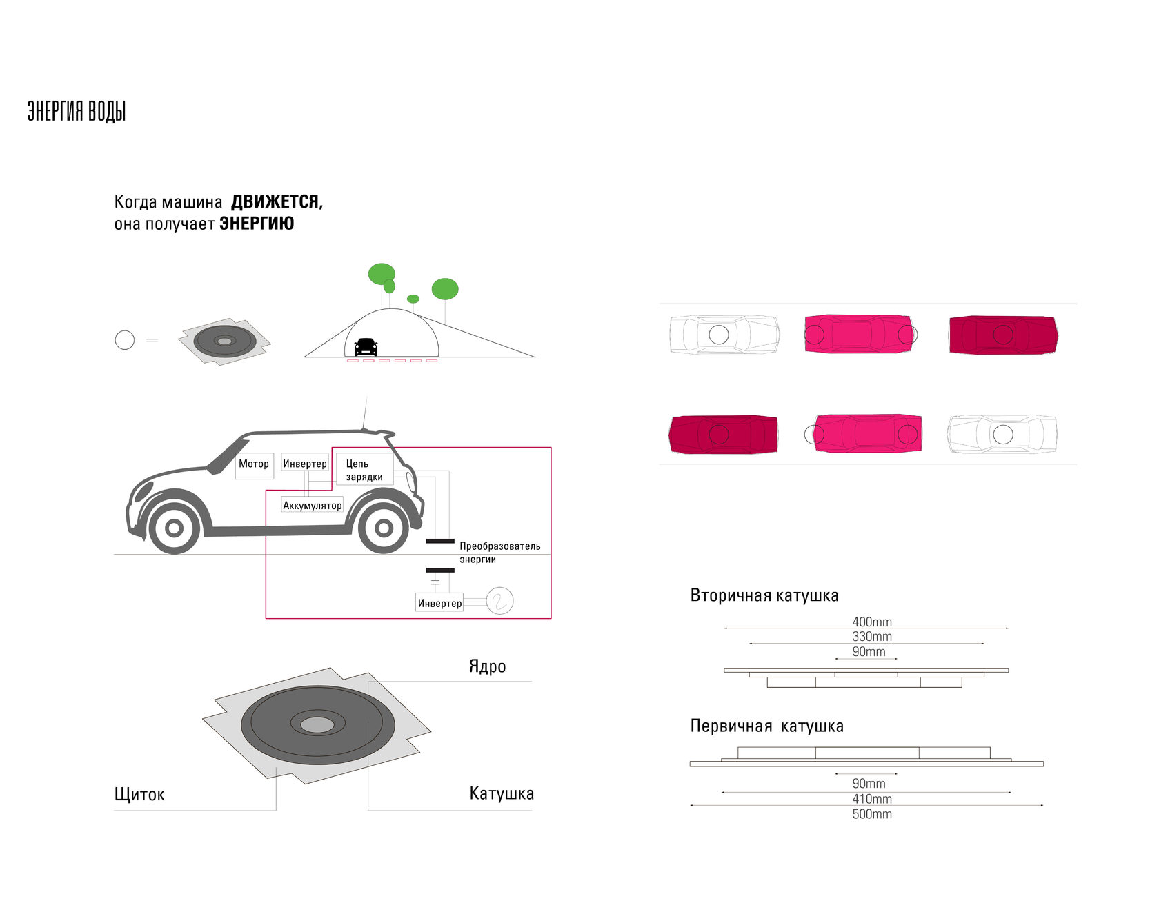 A road structure with built-in transmitters capable of transforming energy while vehicles are moving along them. The road surface consists of an electromagnetic carpet with emitters that transfer energy to a collector placed under the floor of the car to recharge the batteries while the car is moving.