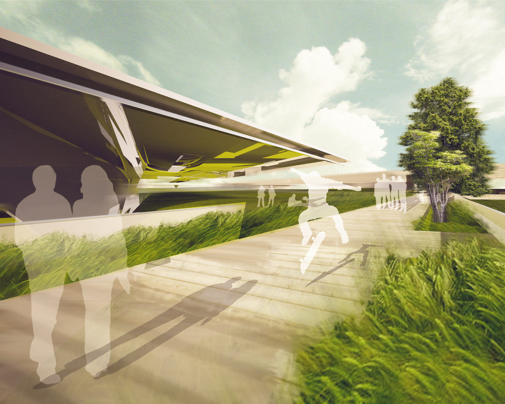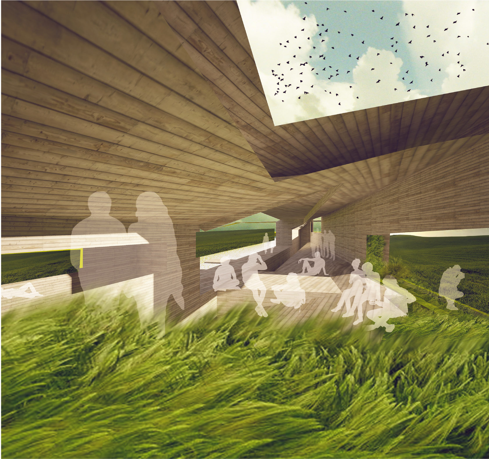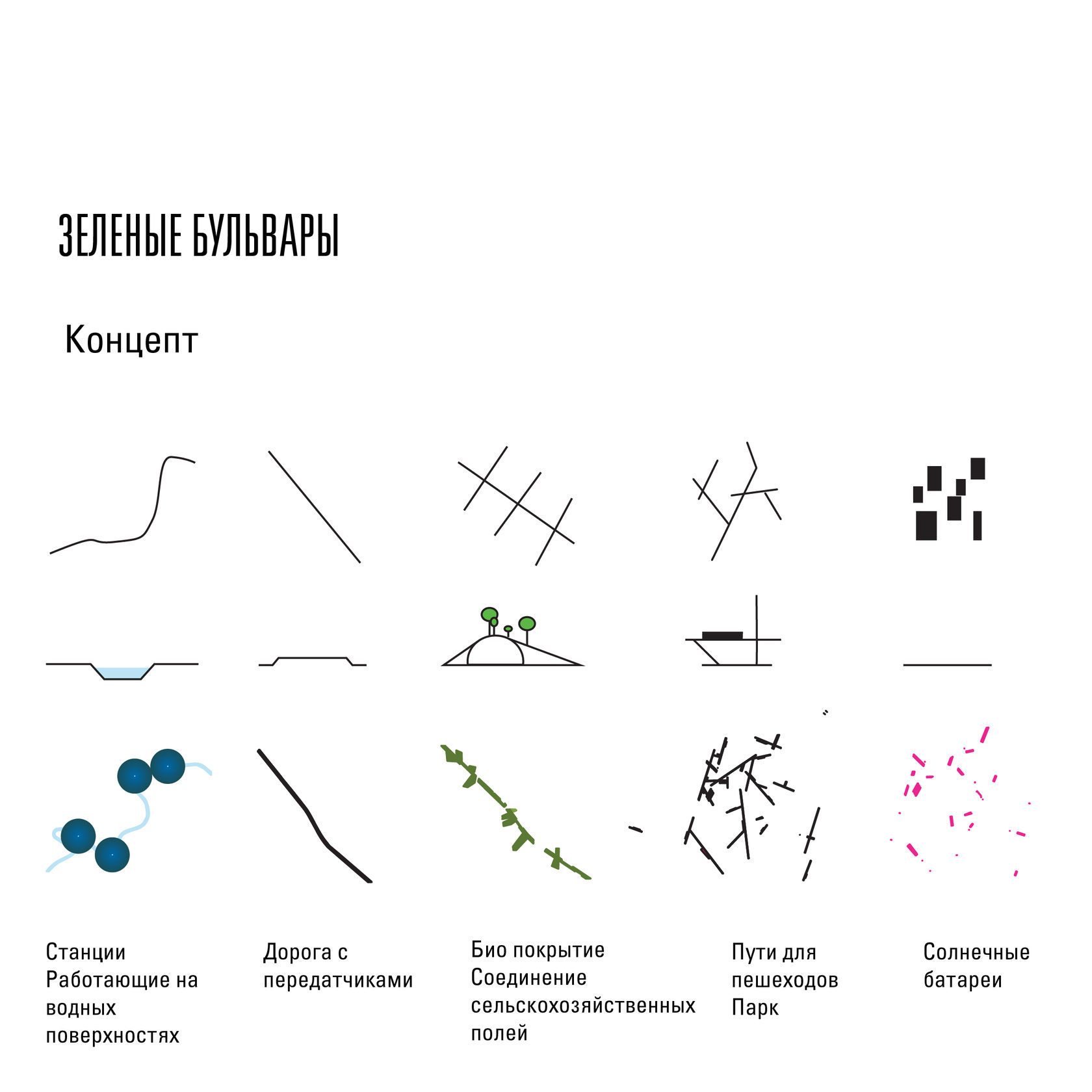 A combination of three main components: - Biologically clean road (electromagnetic phenomenon) - Green corridor blocking the road - A system of boulevards consisting of spaces for people interested in the agricultural sector. The boulevards are not located on the surface of agricultural fields, but at the level of a green corridor supported by the structure. Financing: - Reorganization of the roadway, introduction of a new type of car (70%) -Green corridor (20%) -Networks (10%) -Pedestrian boulevards (private funding)